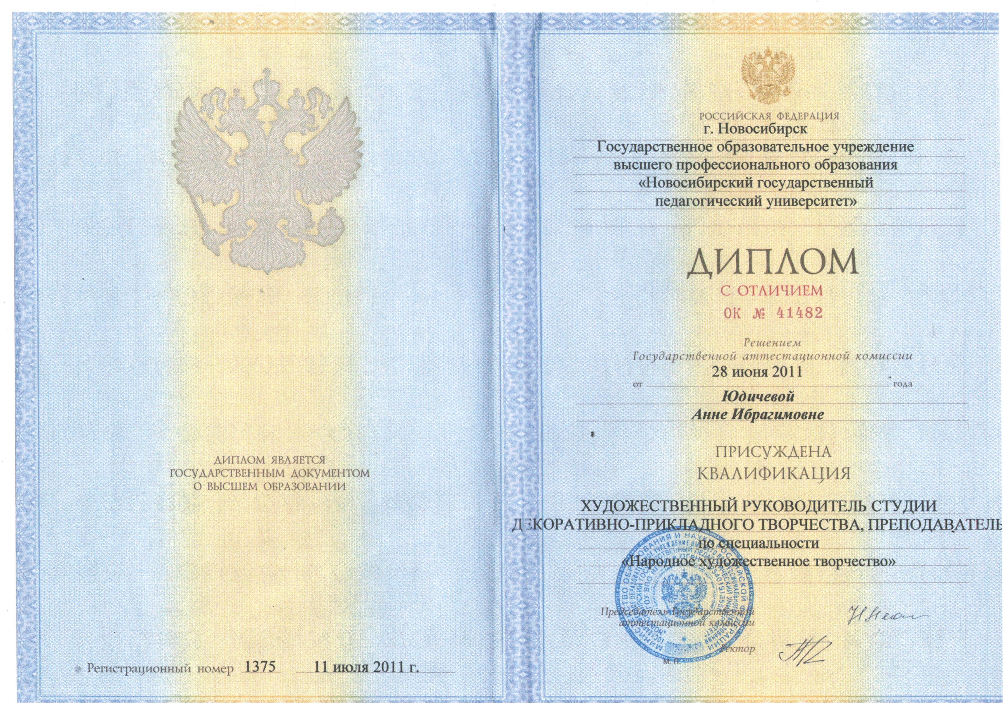 Образование по специальности: Народное художественное творчество. Присвоена квалификация: художественный руководитель студии декоративно-прикладного творчества, преподаватель.. Документ о получении образования: скачать