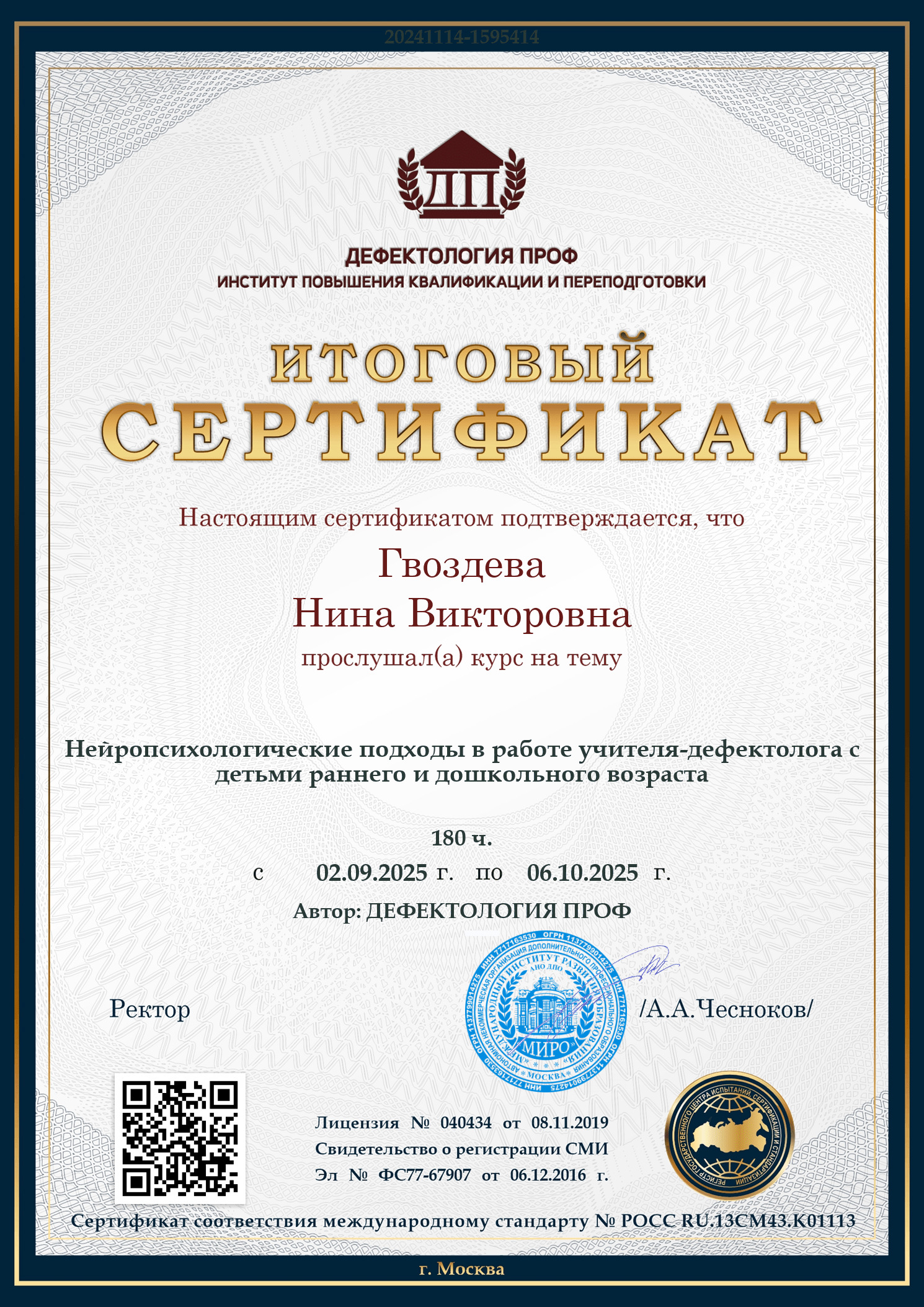 Обучение по курсу: "Нейропсихологические подходы в работе учителя-дефектолога с детьми раннего и дошкольного возраста" . Документ о повышении квалификации: скачать