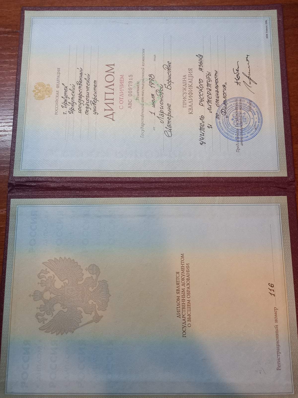 Образование по специальности: Филология. Присвоена квалификация: Учитель русского языка и литературы. Документ о получении образования: скачать