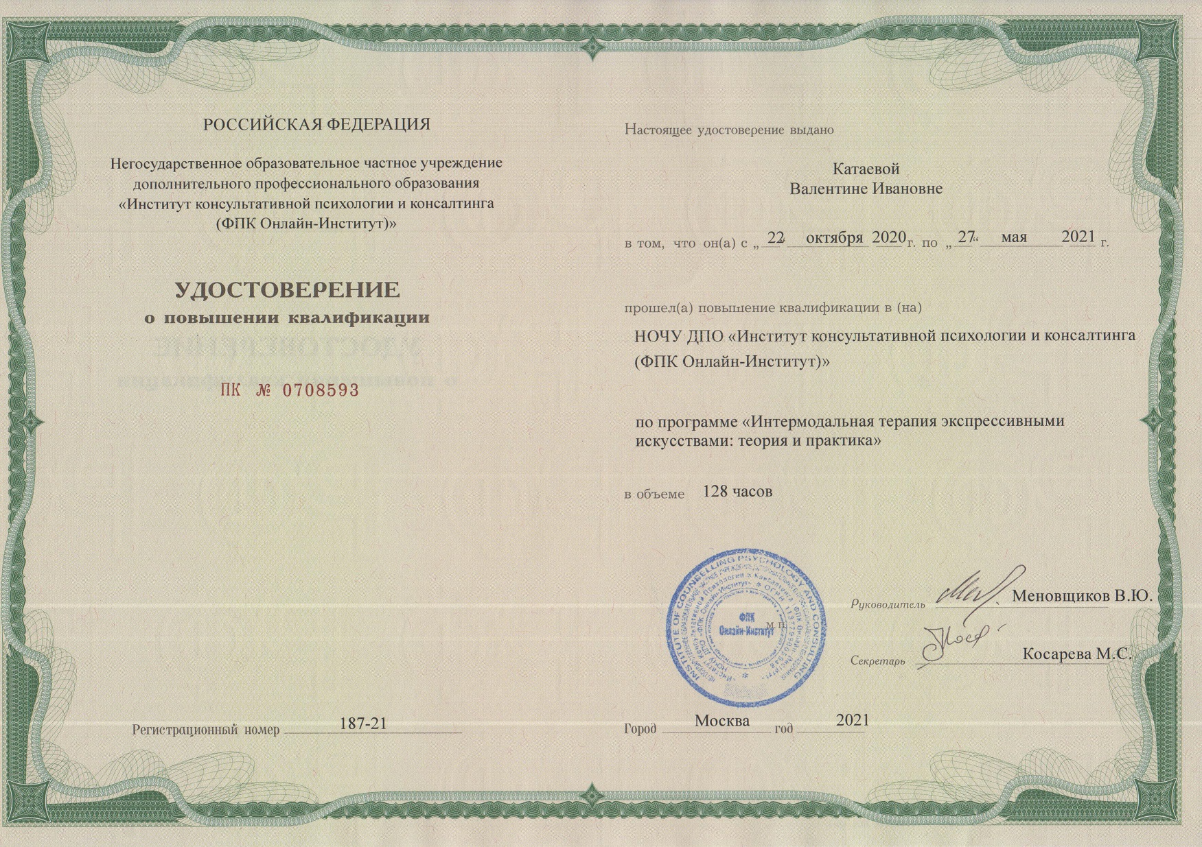 Образование по специальности: Практическая психология в системе образования. Присвоена квалификация: педагог-психолог. Документ о получении образования: скачать