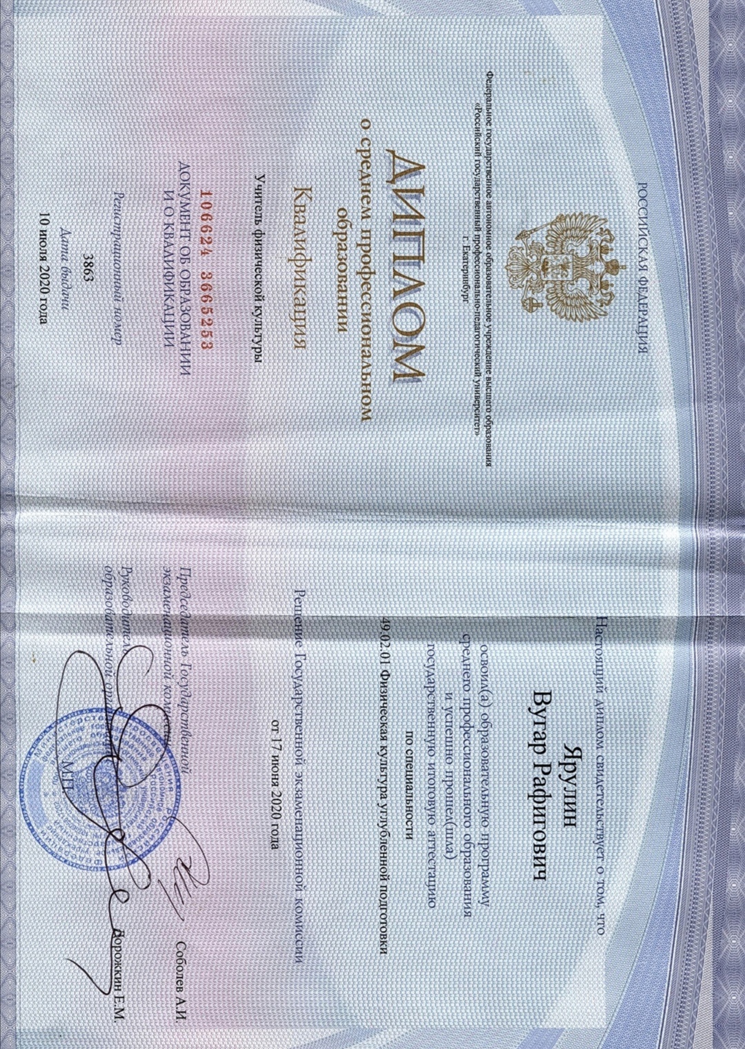 Образование по специальности: Физическая культура углубленной подготовки. Присвоена квалификация: Учитель физической культуры. Документ о получении образования: скачать