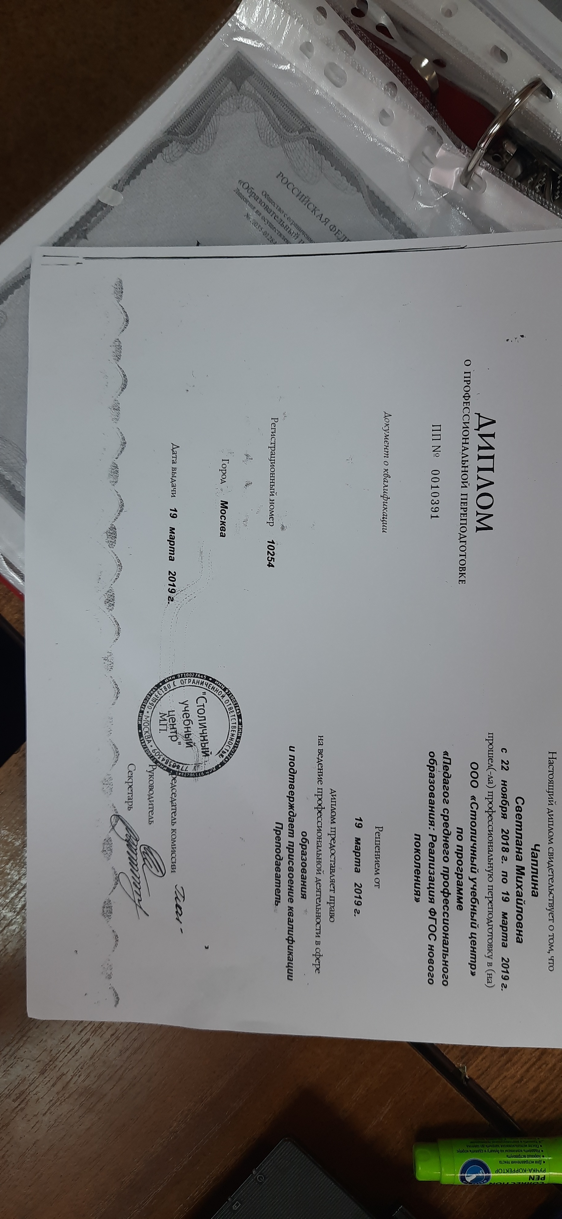 Образование по специальности: Педагог среднего профессионального образования. Присвоена квалификация: Реализация ФГОС нового поколения.. Документ о получении образования: скачать