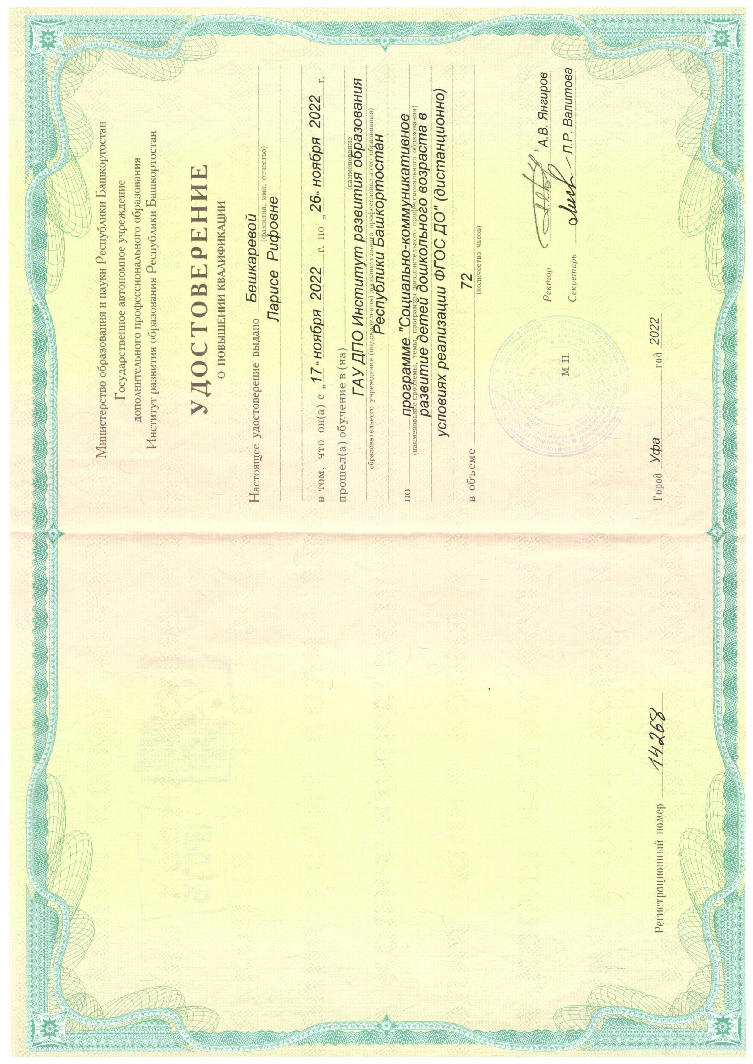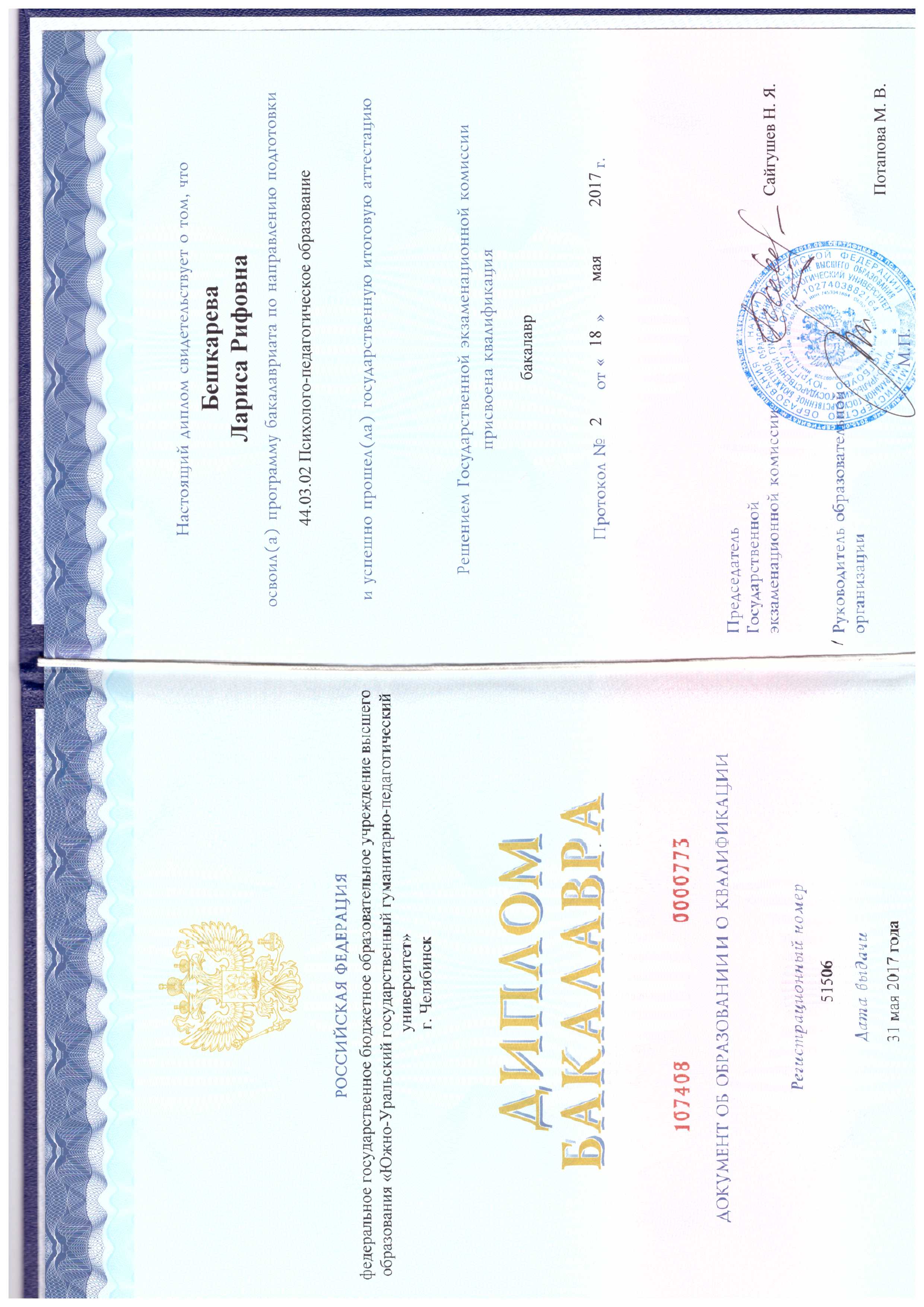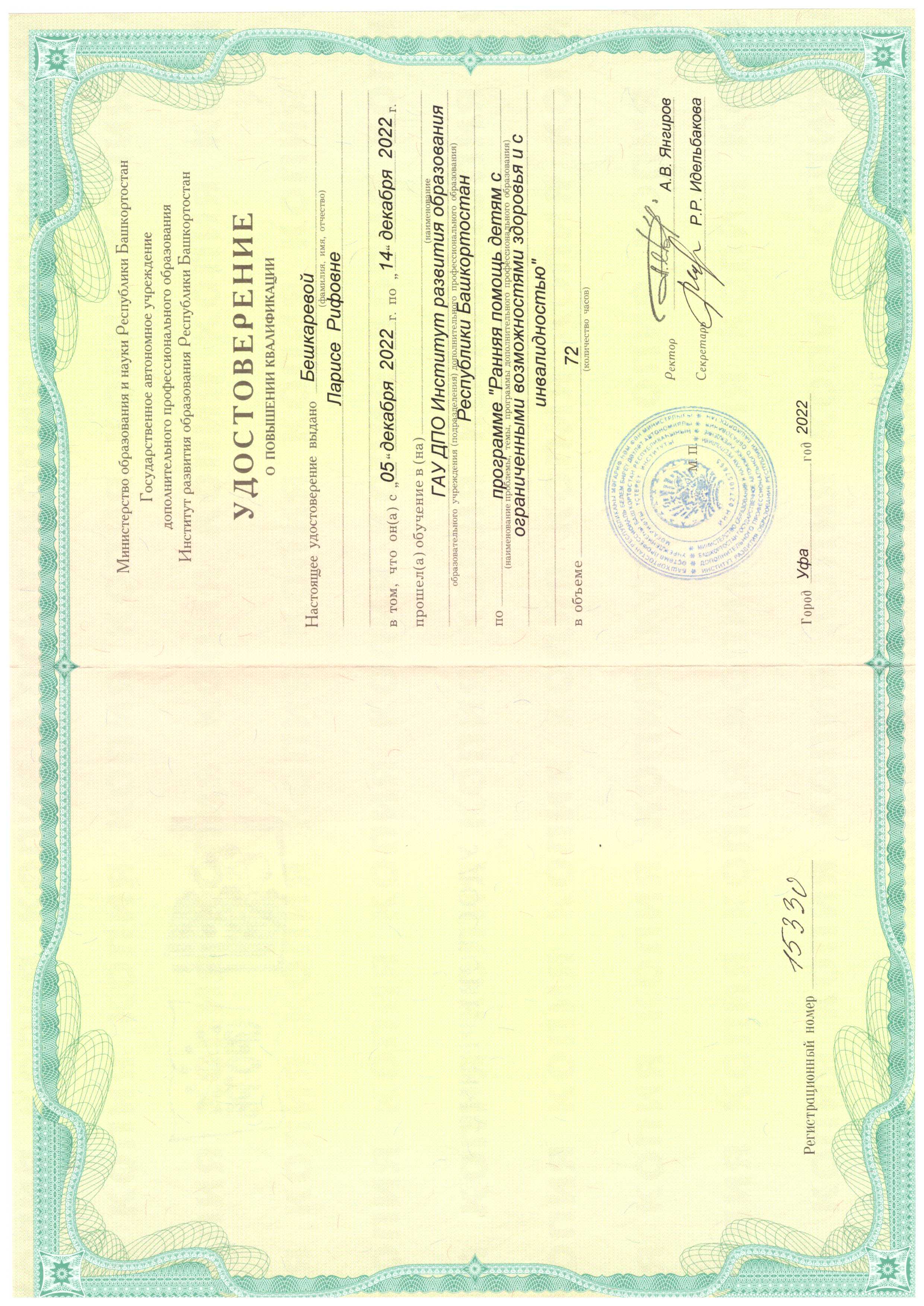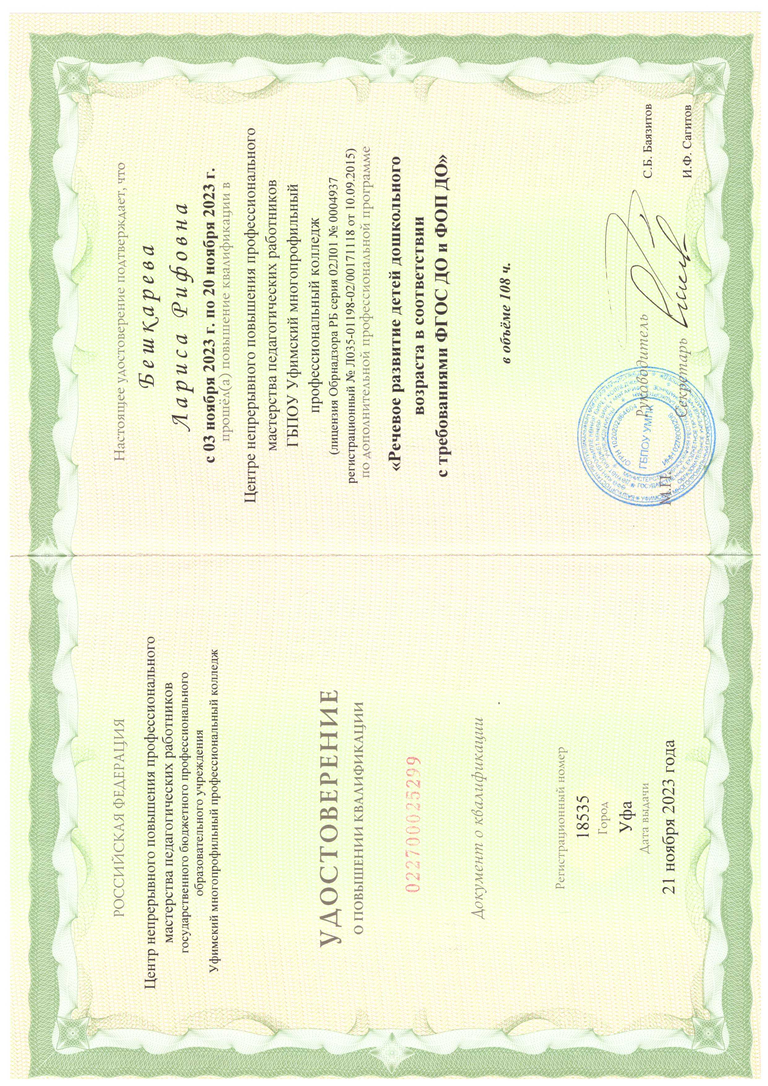 Образование по специальности: Психолого-педагогическое образование. Присвоена квалификация: Воспитатель. Документ о получении образования: скачать