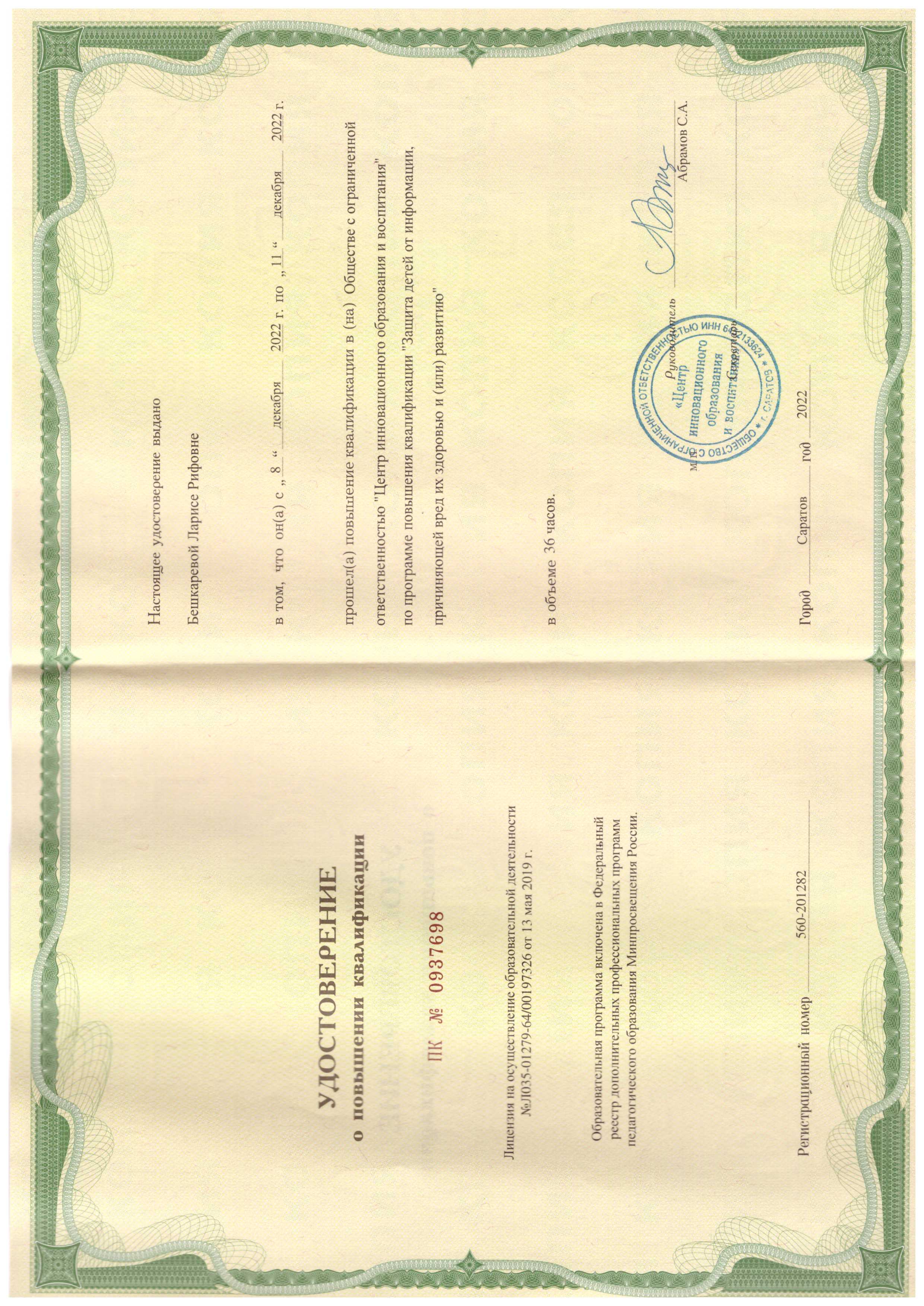 Обучение по курсу: Защита детей от информации, причиняющей вред их здоровью и (или) развитию. Документ о повышении квалификации: скачать
