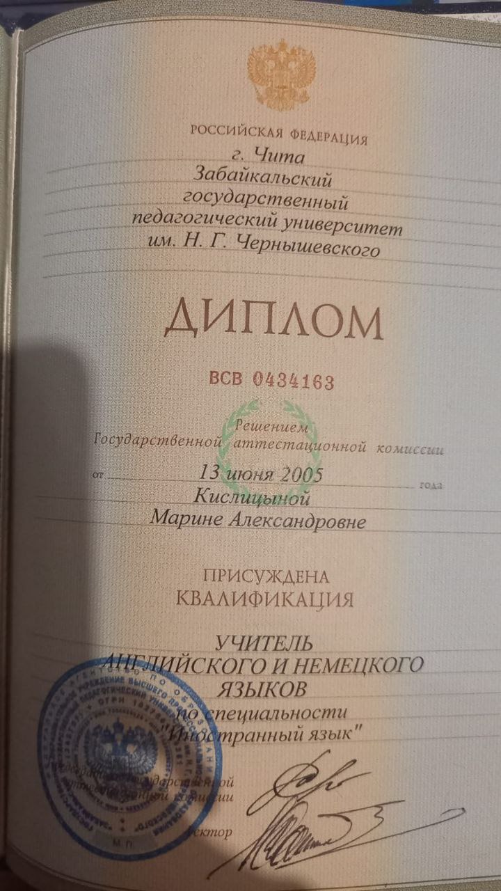 Образование по специальности: иностранный язык. Присвоена квалификация: учитель английского и немецкого языков. Документ о получении образования: скачать