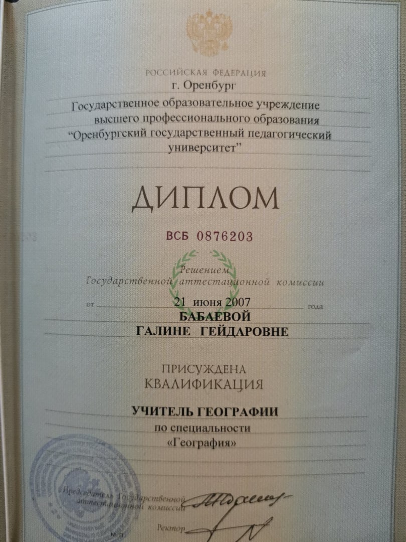 Образование по специальности: учитель географии. Присвоена квалификация: География. Документ о получении образования: скачать