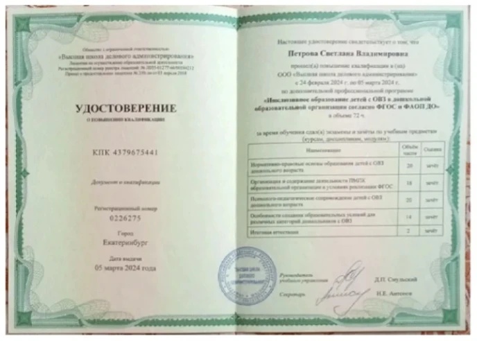 Обучение по курсу: "Инклюзивное образование детей с ОВЗ в образовательной организации согласно ФГОС и ФАОП ДО". Документ о повышении квалификации: скачать