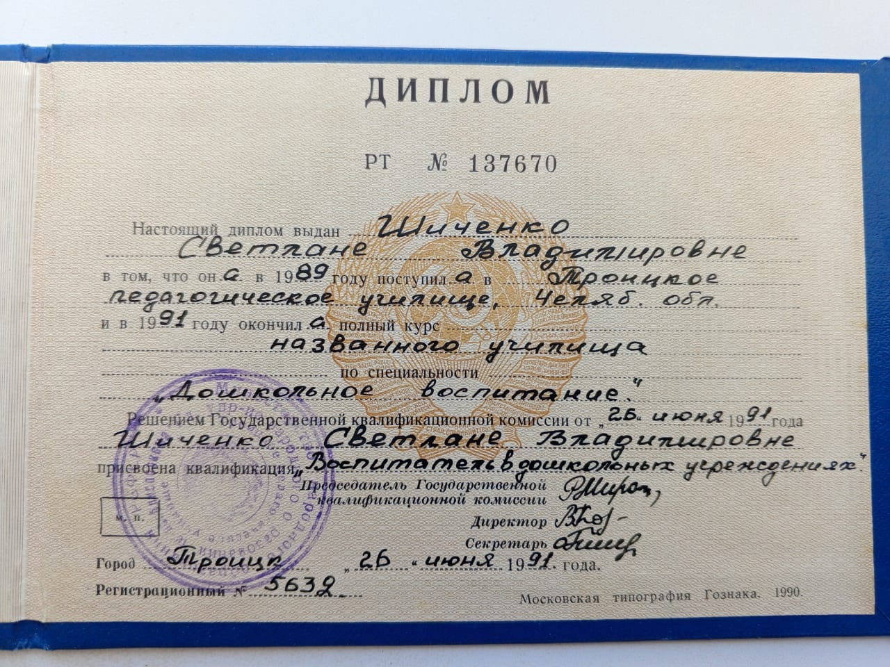 Образование по специальности: дошкольная педагогика. Присвоена квалификация: воспитатель. Документ о получении образования: скачать