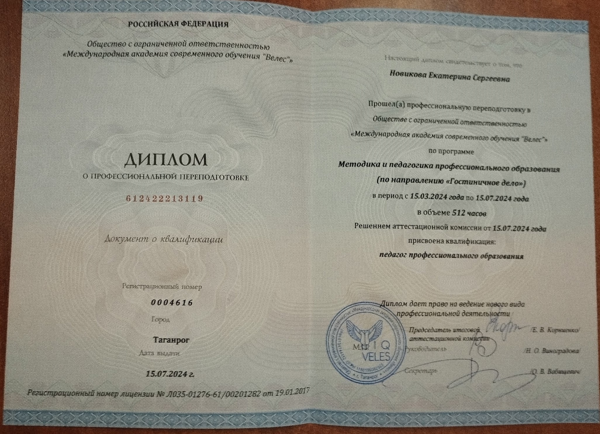 Образование по специальности: Методика и педагогика профессионального образования (по направлению Гостиничное дело). Присвоена квалификация: педагог профессионального образования. Документ о получении образования: скачать