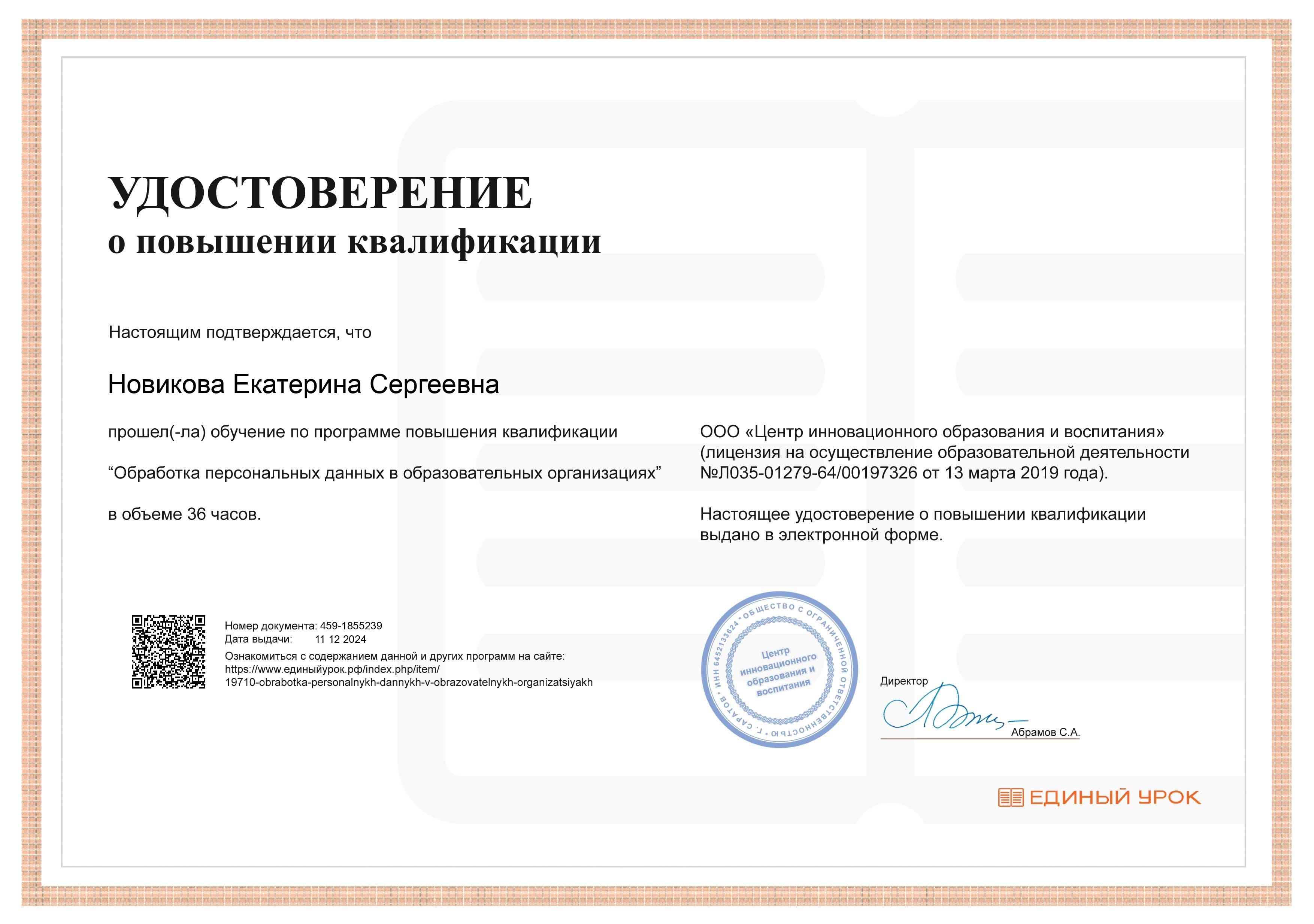 Обучение по курсу: Обработка персональных данных в образовательных организациях. Документ о повышении квалификации: скачать