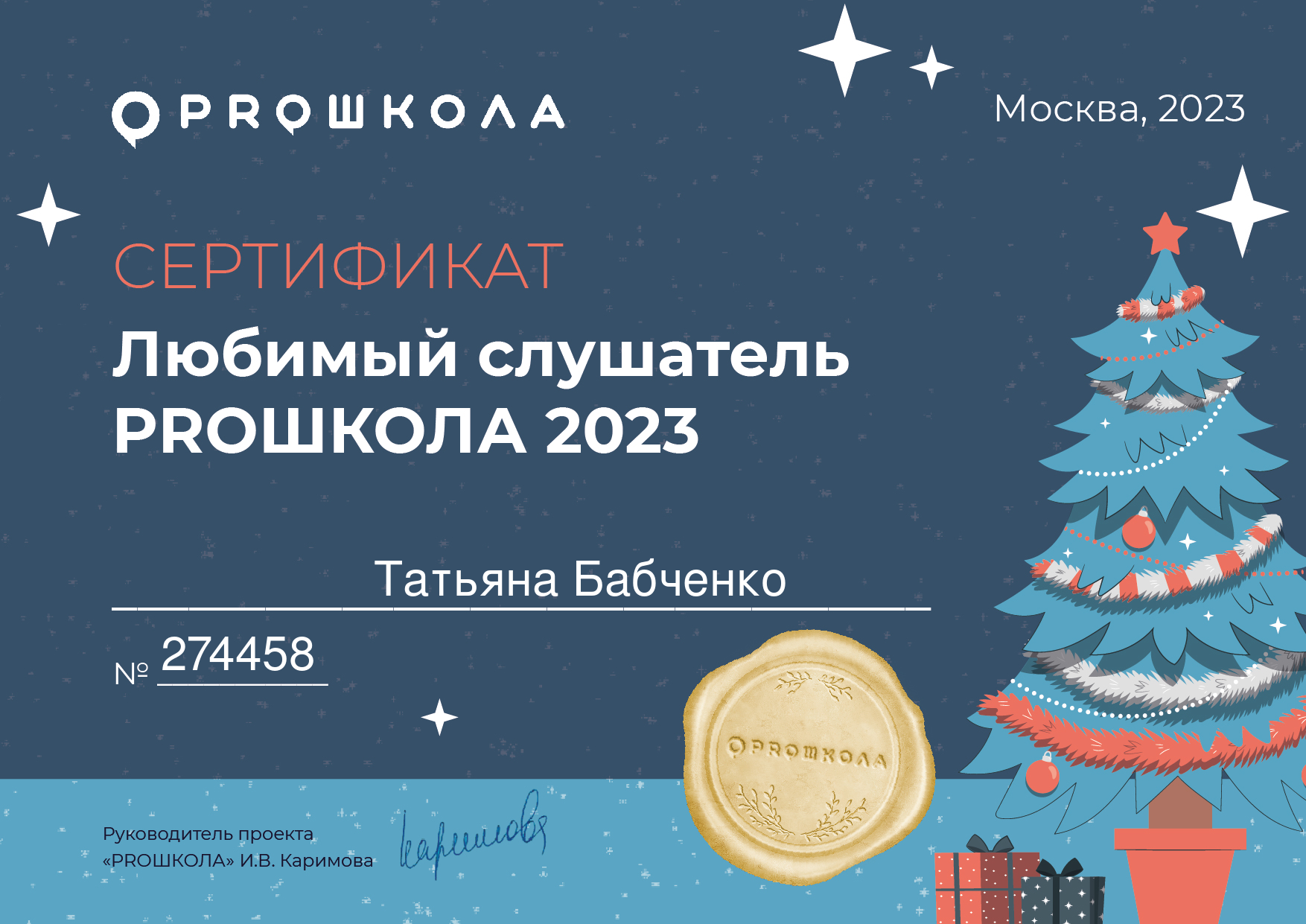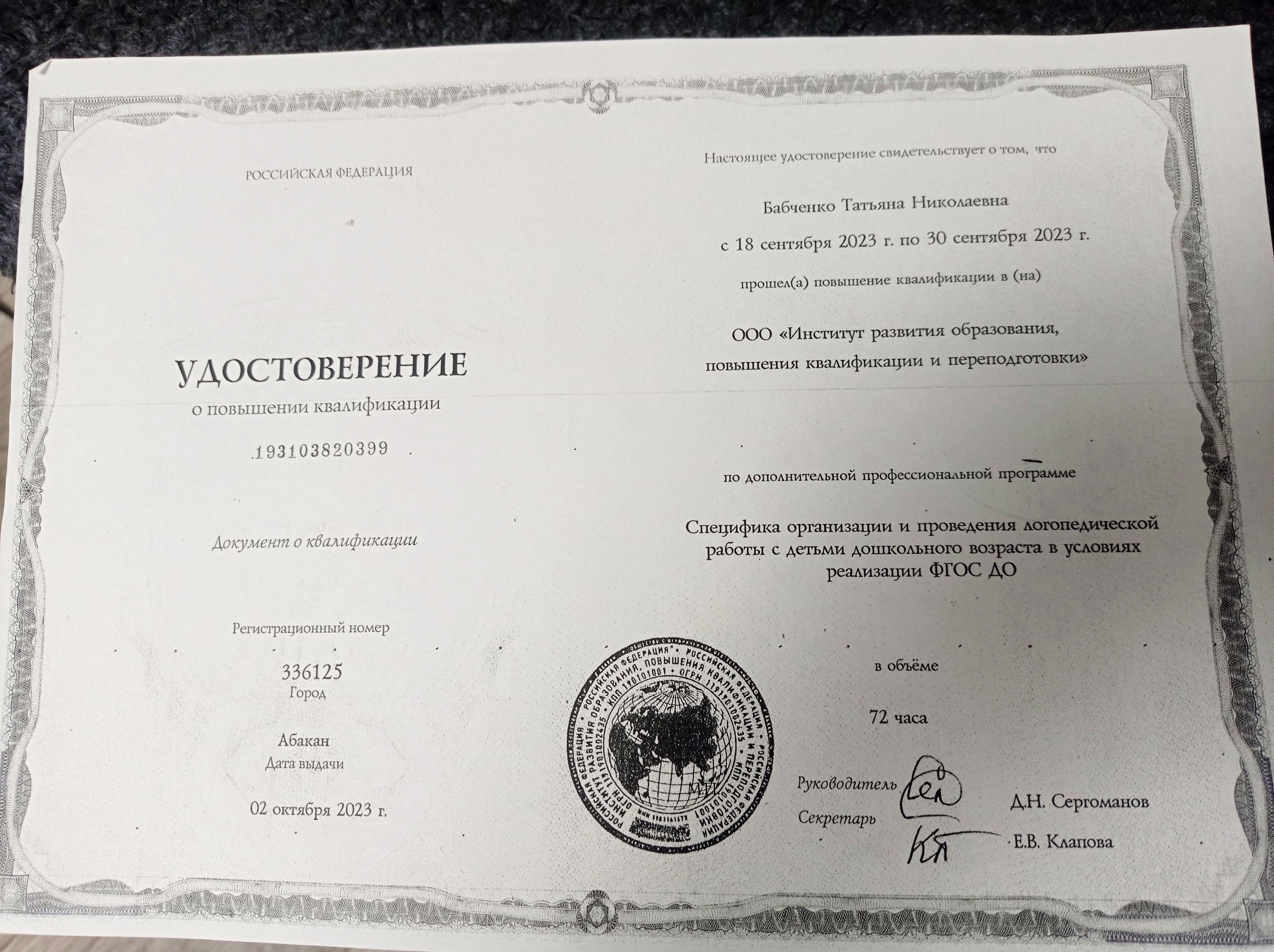 Образование по специальности: 031700 "Олигофренопедагогика" с дополнительной специальностью 031800 "Логопедия". Присвоена квалификация: Олигофренопедагог. Учитель - логопед. Документ о получении образования: скачать