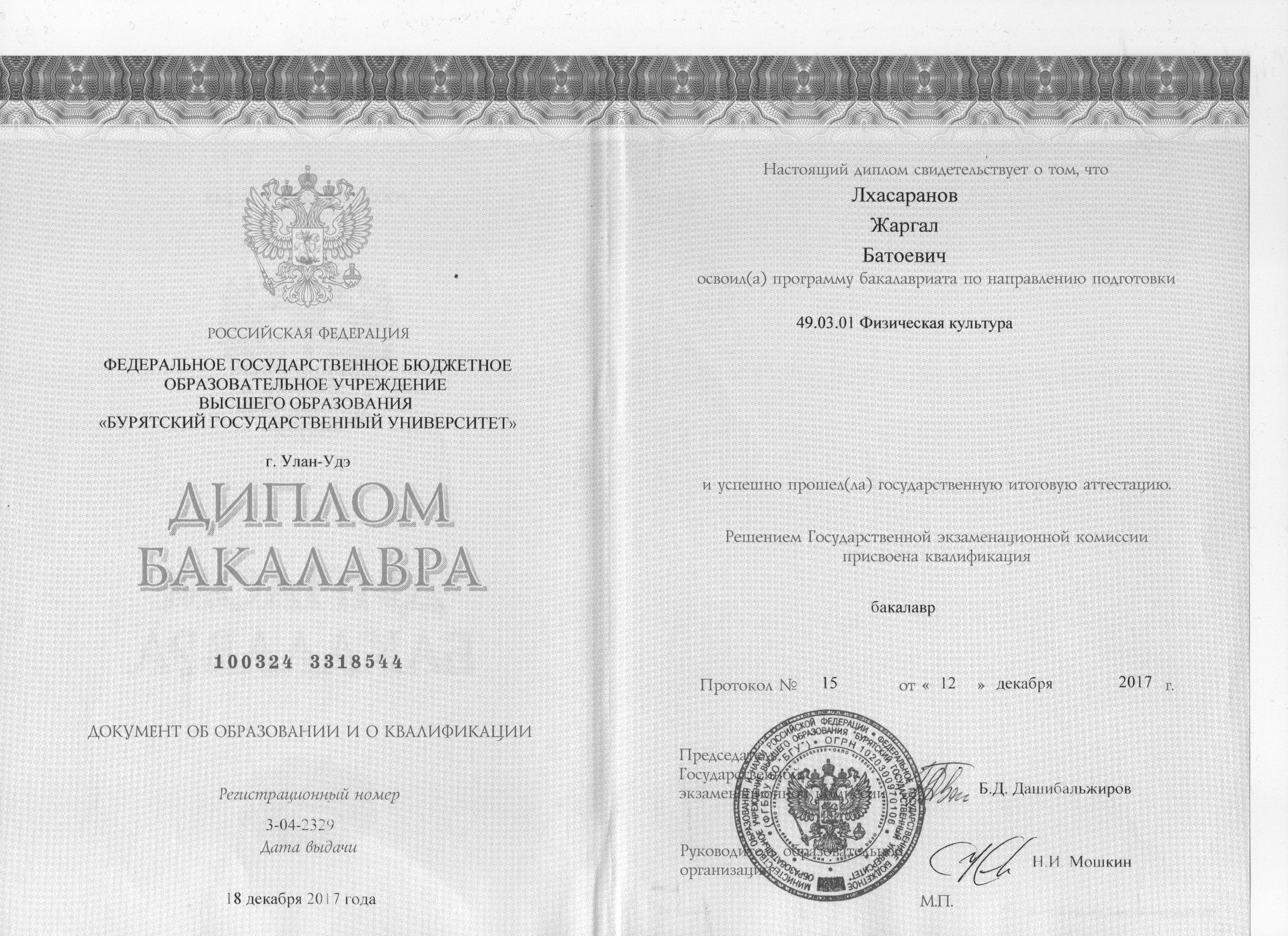 Образование по специальности: Физическая культура. Присвоена квалификация: Бакалавр. Документ о получении образования: скачать