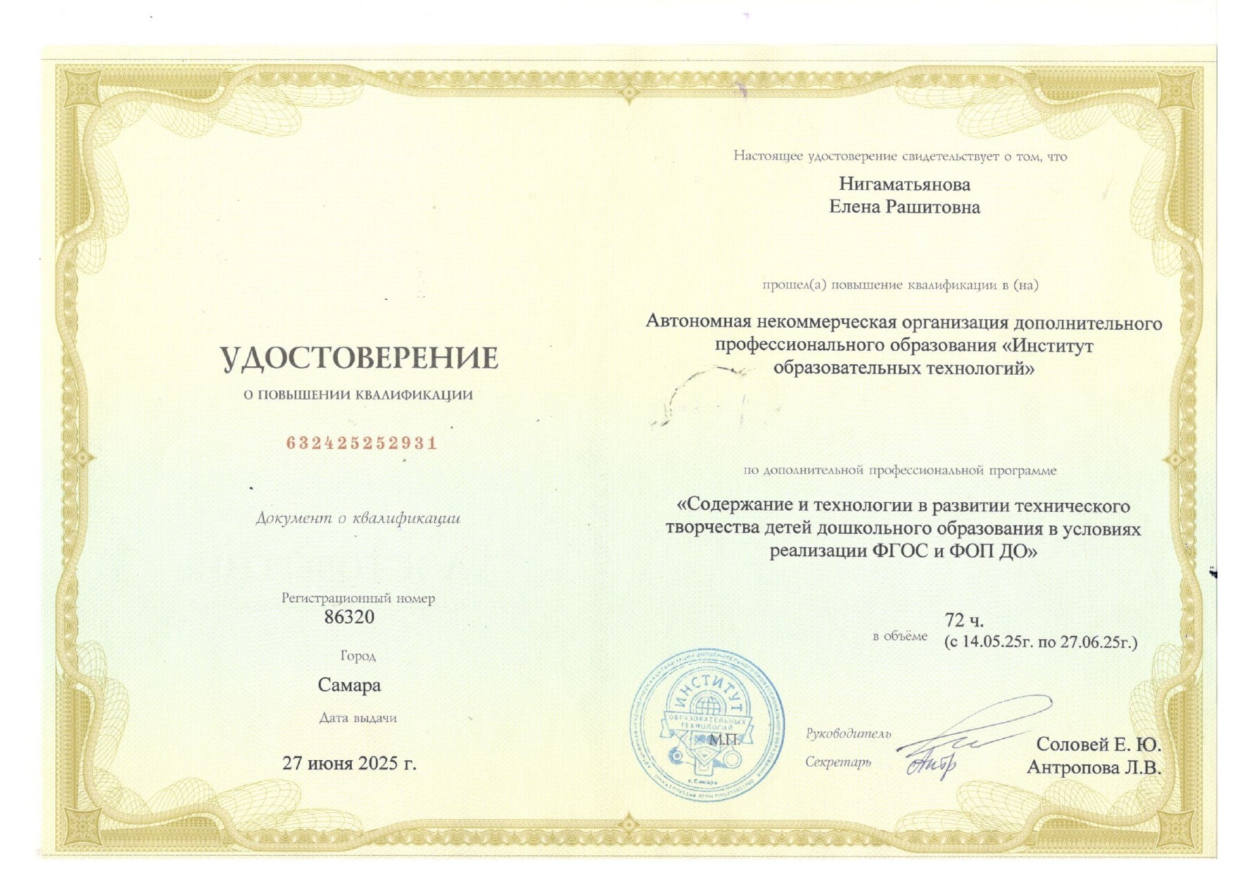 Обучение по курсу: "Содержание и технологии в развитии технического творчества детей дошкольного образования в условиях реализации ФГОС и ФОП ДО". Документ о повышении квалификации: скачать