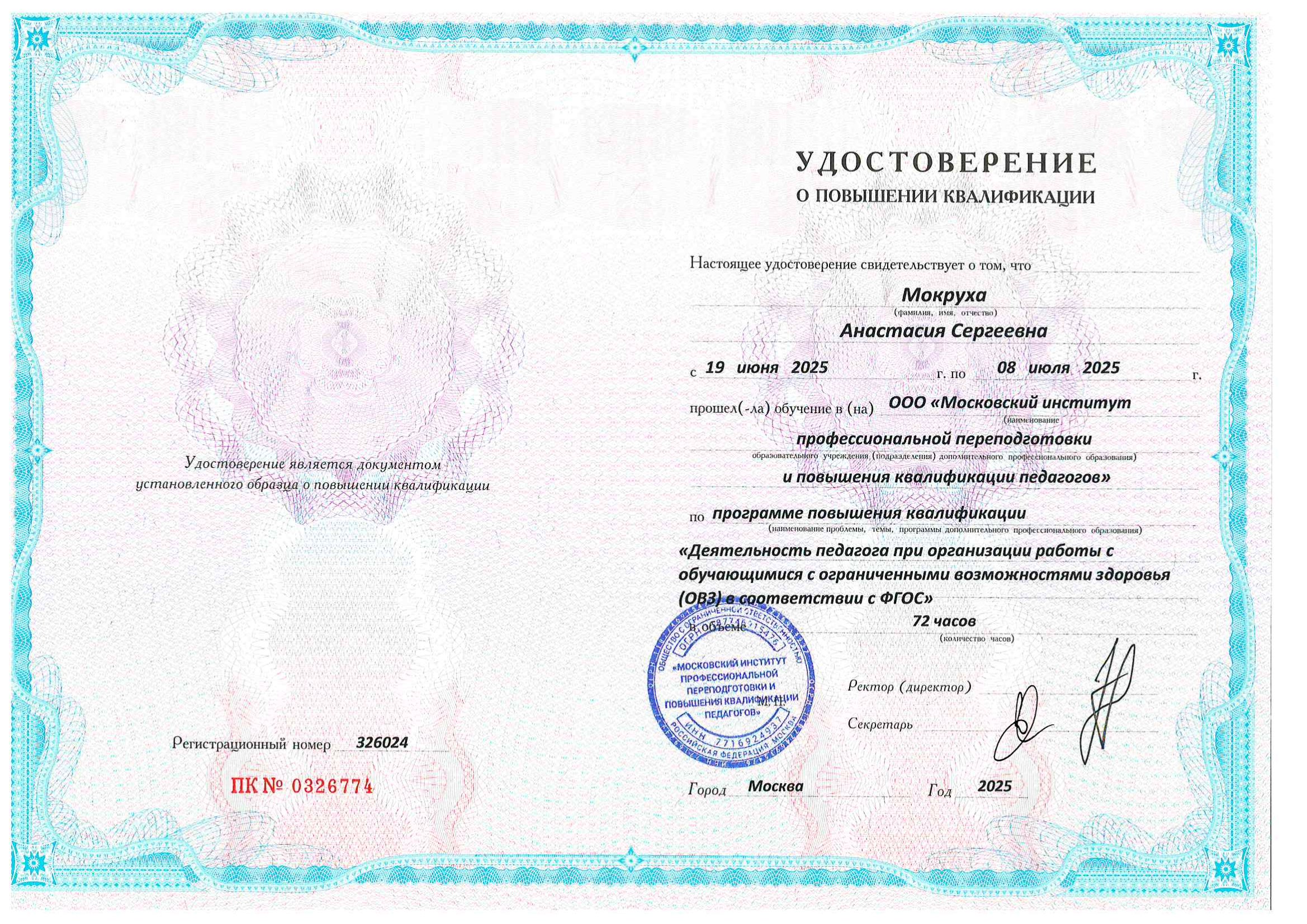 Обучение по курсу: "Деятельность педагога при организации работы с обучающимися с ограниченными возможностями здоровья (ОВЗ) в соответствии с ФГОС ". Документ о повышении квалификации: скачать