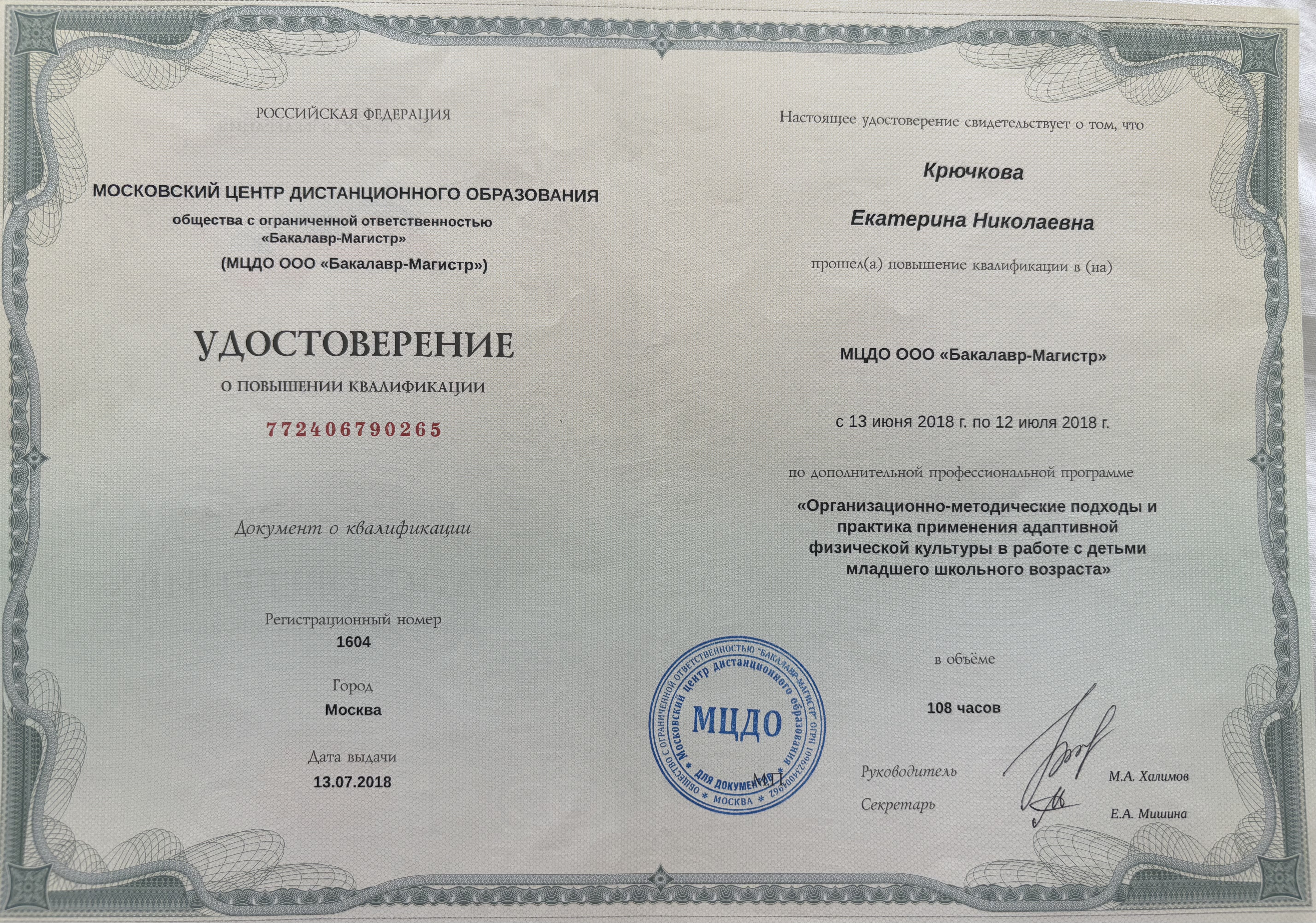 Обучение по курсу: Организационно-методические подходы и практика применения адаптивной физкультуры работе с детьми младшего школьного возраста . Документ о повышении квалификации: скачать