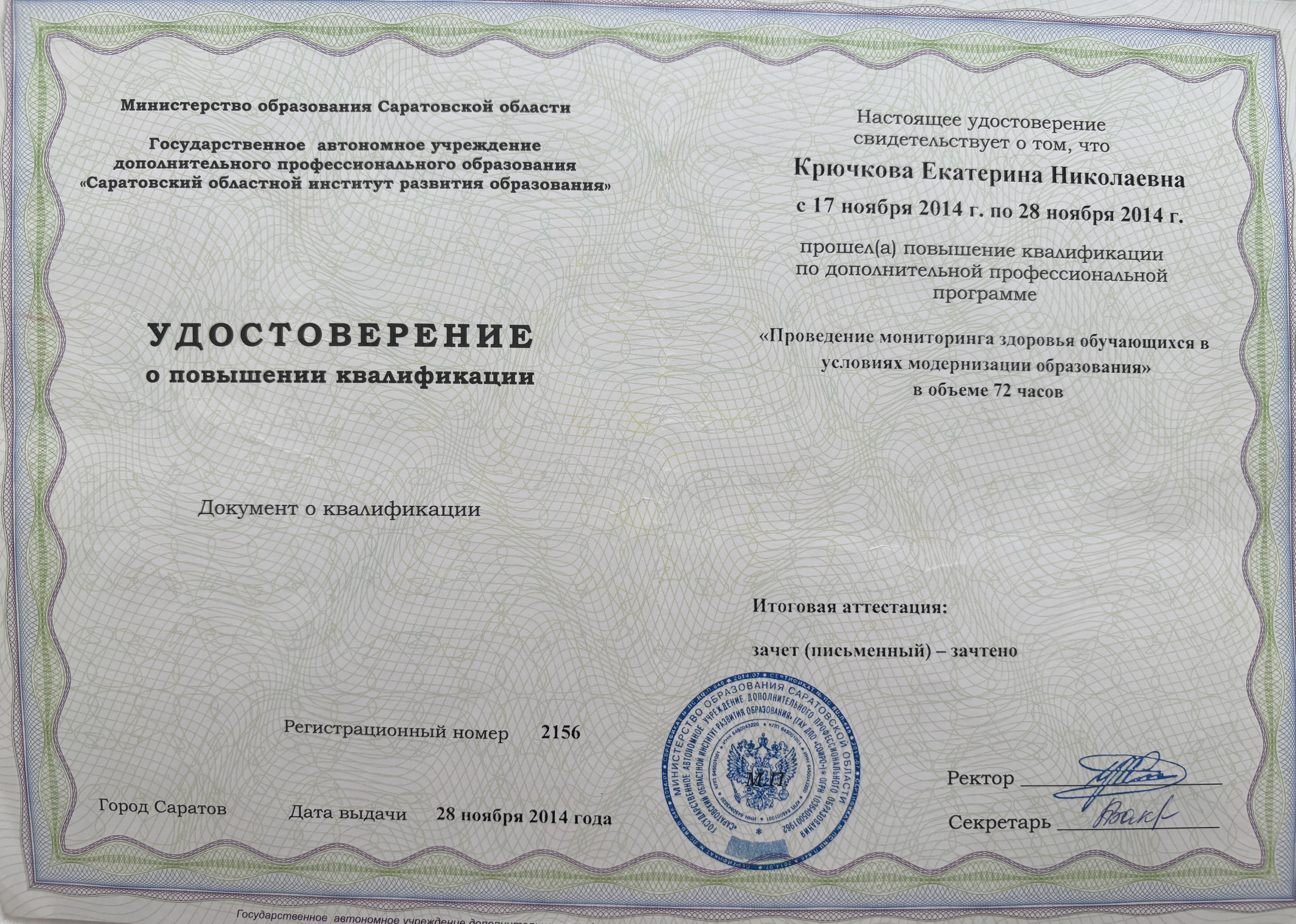 Обучение по курсу: Проведение мониторинга здоровья обучающихся в условиях модернизации образования . Документ о повышении квалификации: скачать