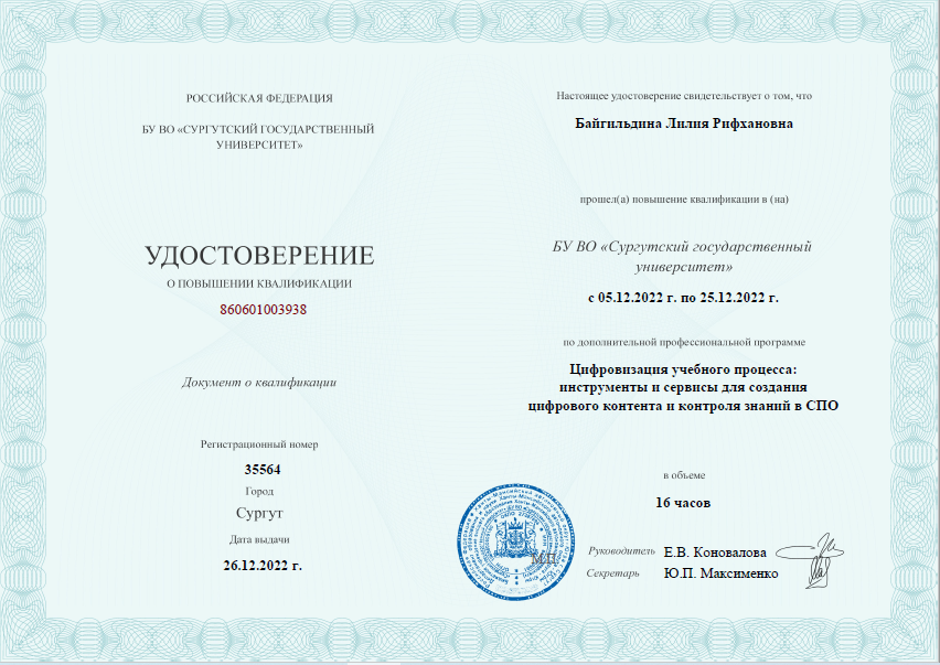 Обучение по курсу: Цифровизация учебного процесса: инструменты и сервисы для создания цифрового контента и контроля знаний в СПО. Документ о повышении квалификации: скачать