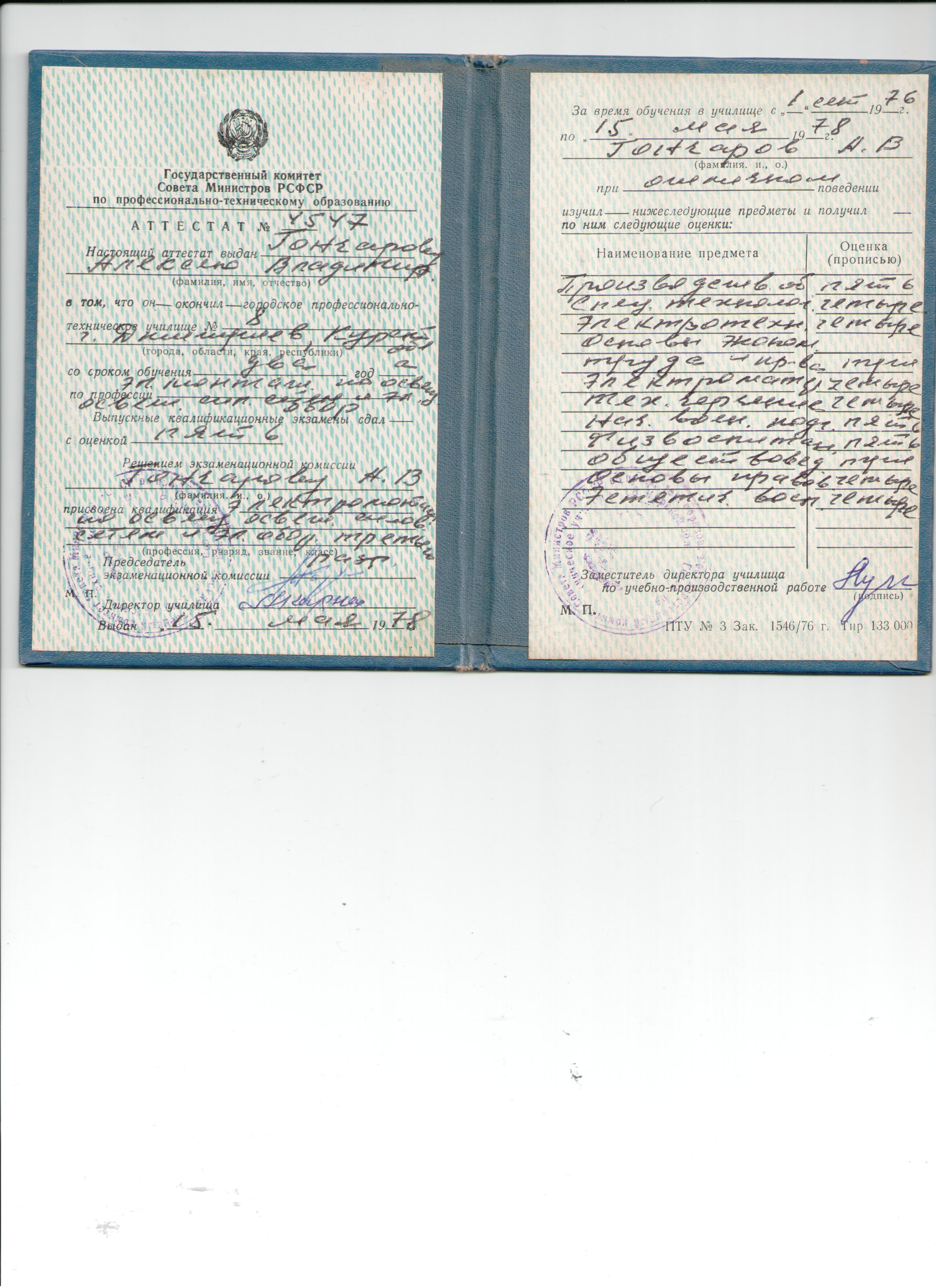Образование по специальности: Начальное - профессиональное, Профессионально-техническое училище № 8. Присвоена квалификация: Начальное - профессиональное, Профессионально-техническое училище № 8. Документ о получении образования: скачать