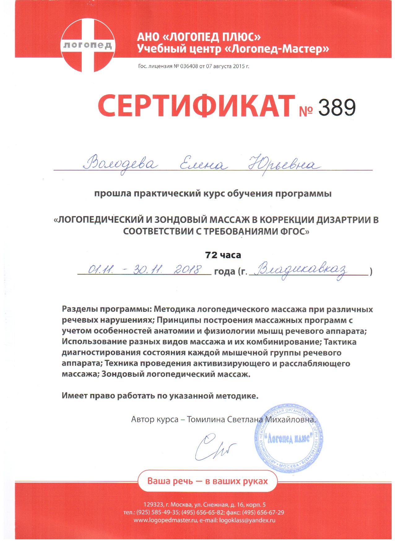 Обучение по курсу: Логопедический и зондовый массаж в коррекции дизартрии в соответствии с требованиями ФГОС. Документ о повышении квалификации: скачать