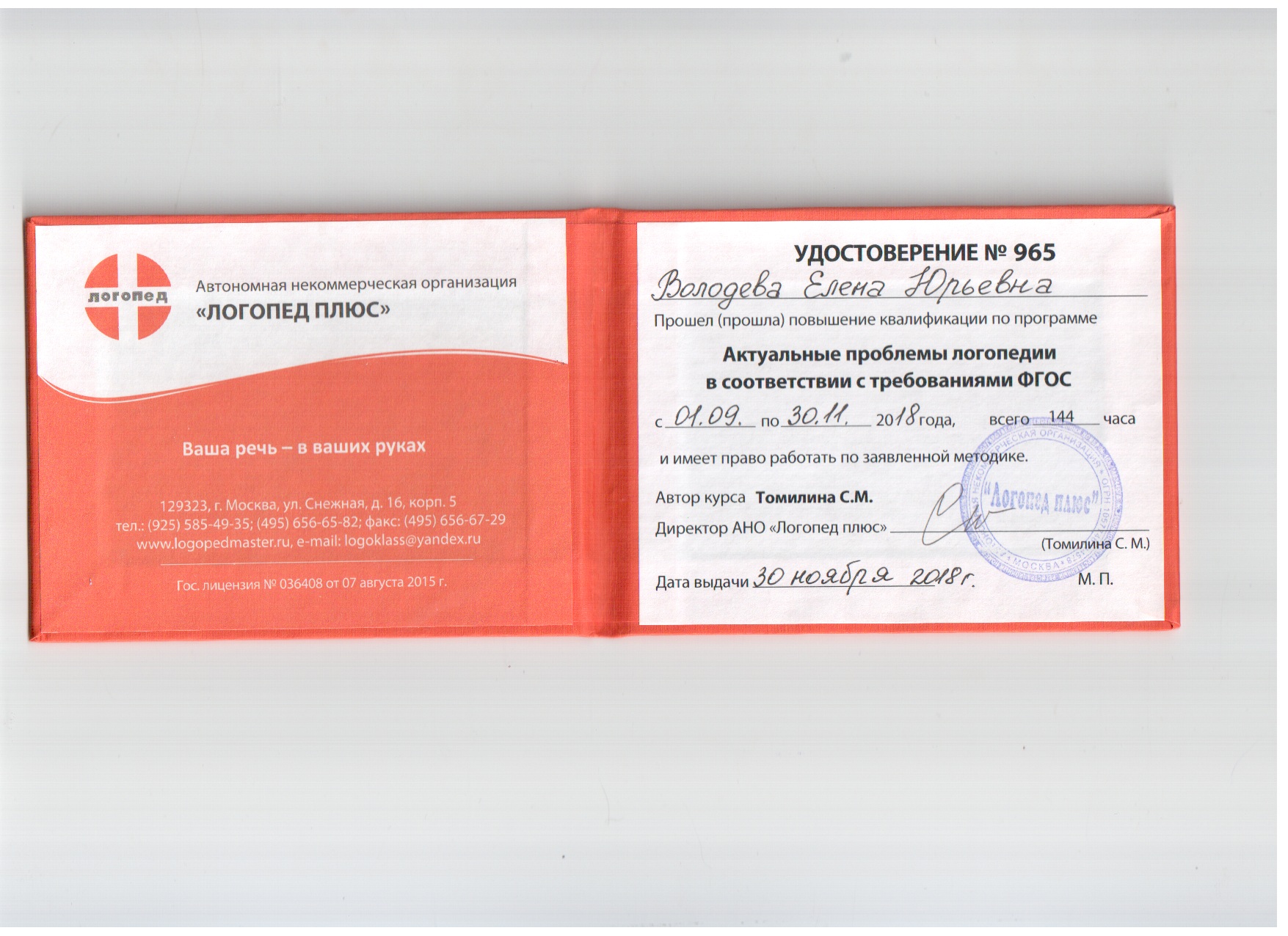 Обучение по курсу: Актуальные проблемы логопедии в соответствии с требованиями ФГОС. Документ о повышении квалификации: скачать