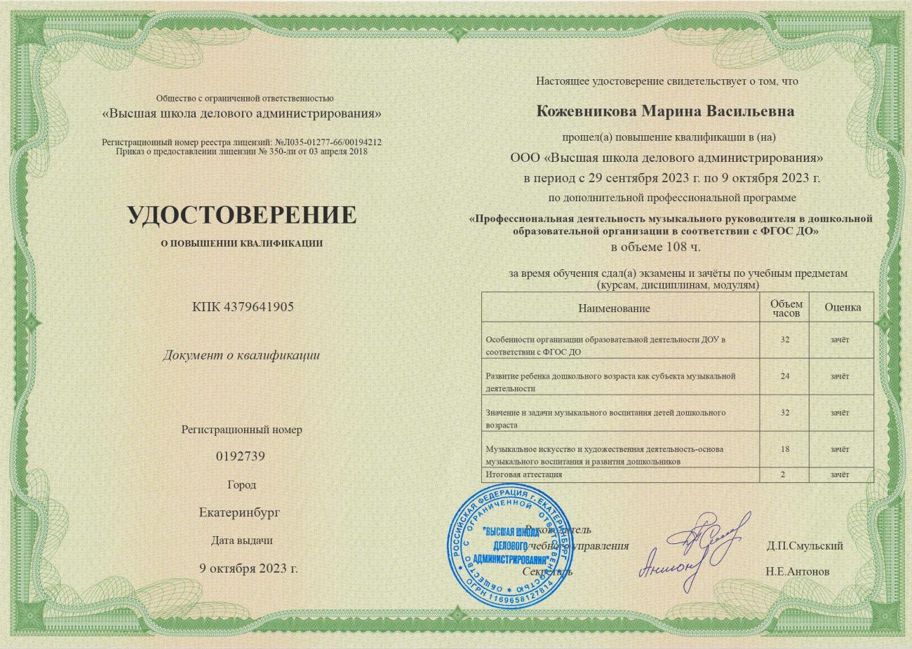 Обучение по курсу: "Профессиональная деятельность музыкального руководителя в дошкольной образовательной организации в соответствии с ФГОС ДО". Документ о повышении квалификации: скачать