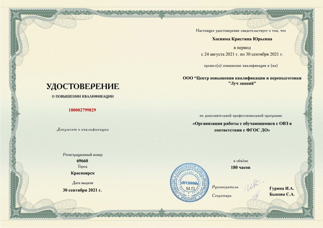 Обучение по курсу: "Организация работы с обучающимися с ОВЗ в соответствии с ФГОС ДО" . Документ о повышении квалификации: скачать