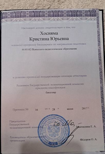 Образование по специальности: Педагогика и психология. Присвоена квалификация: Педагог-психолог. Документ о получении образования: скачать