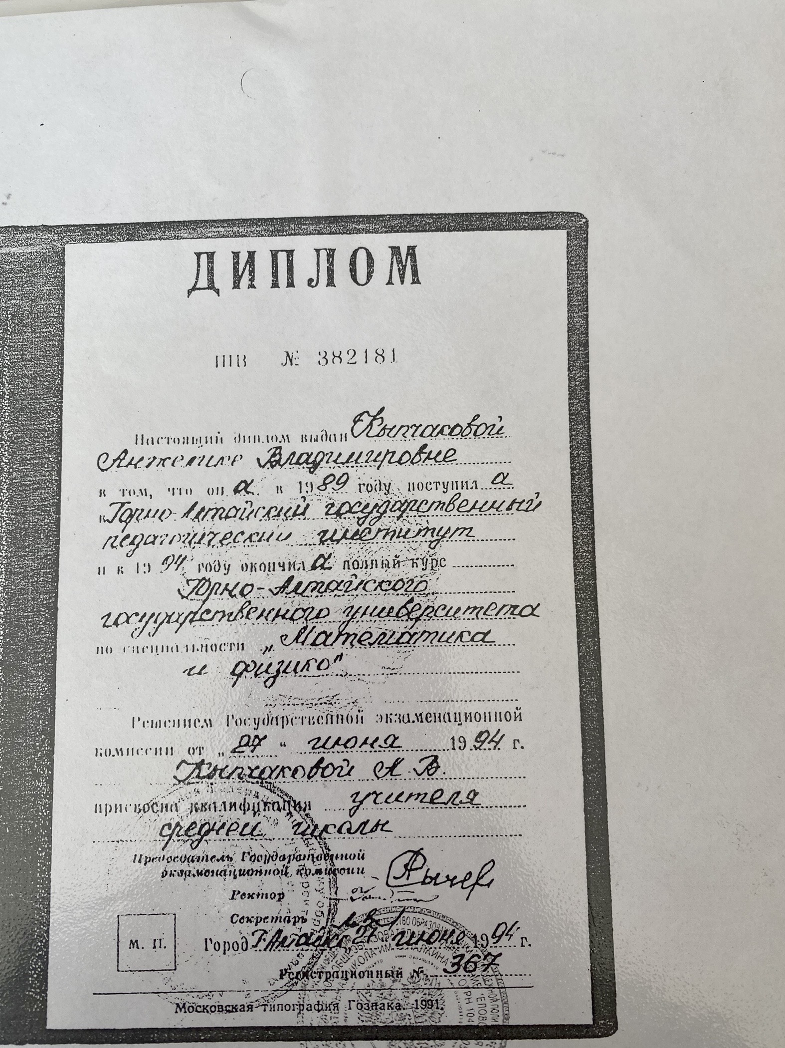Образование по специальности: математика и физика. Присвоена квалификация: учитель математики и физики. Документ о получении образования: скачать