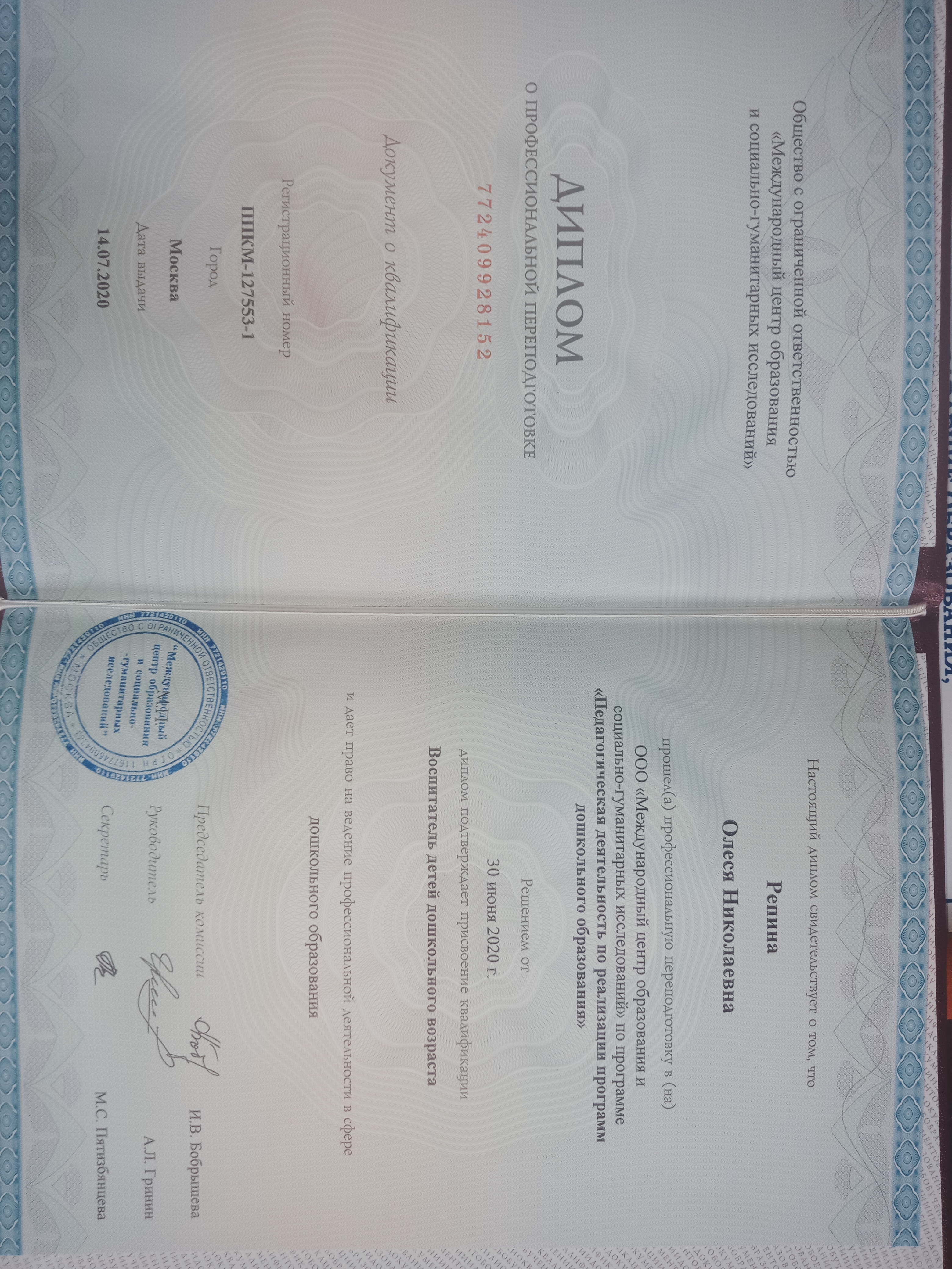 Образование по специальности: Дошкольное образование . Присвоена квалификация: Воспитатель детей дошкольного возраста, руководитель изобразительной деятельности».. Документ о получении образования: скачать
