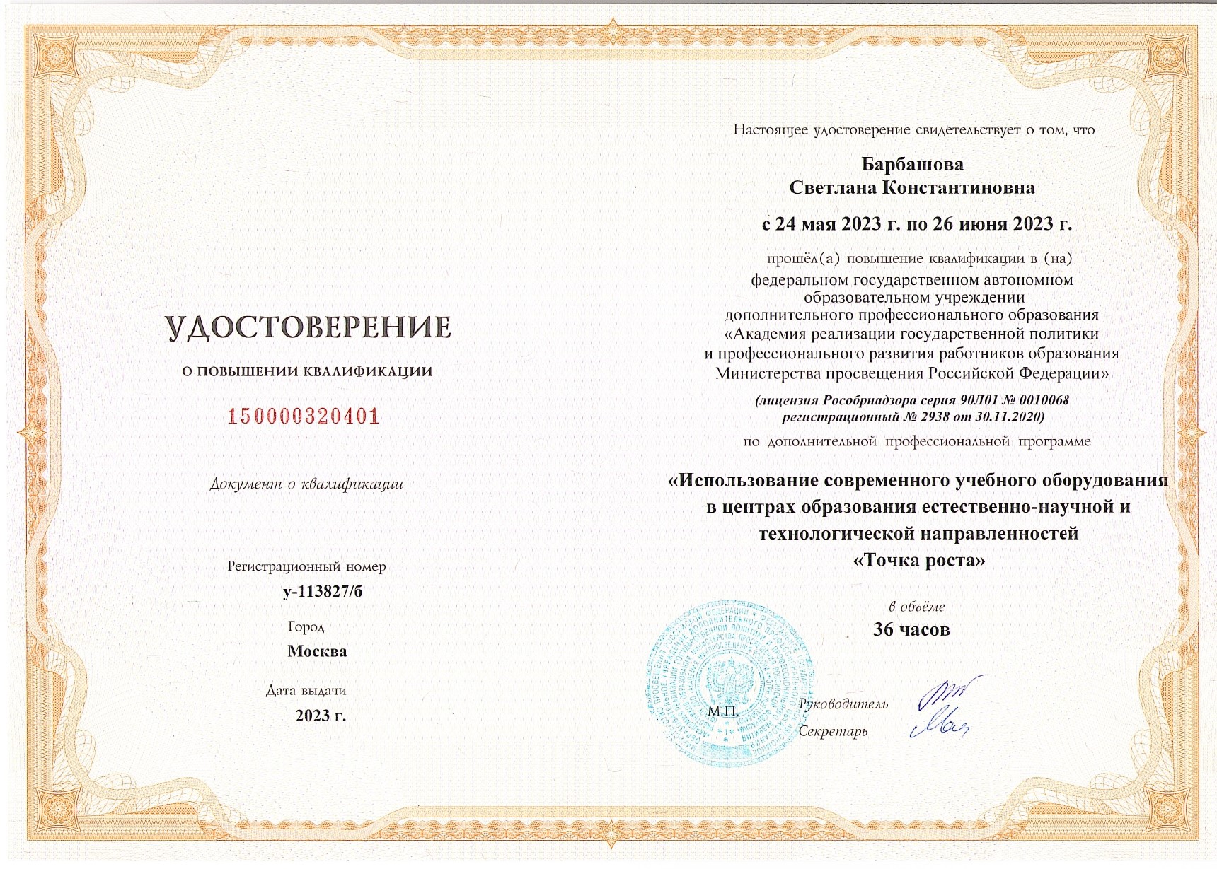 Обучение по курсу: «Использование современного учебного оборудования в центрах образования естественно-научной и технологической направленности «Точка роста». Документ о повышении квалификации: скачать