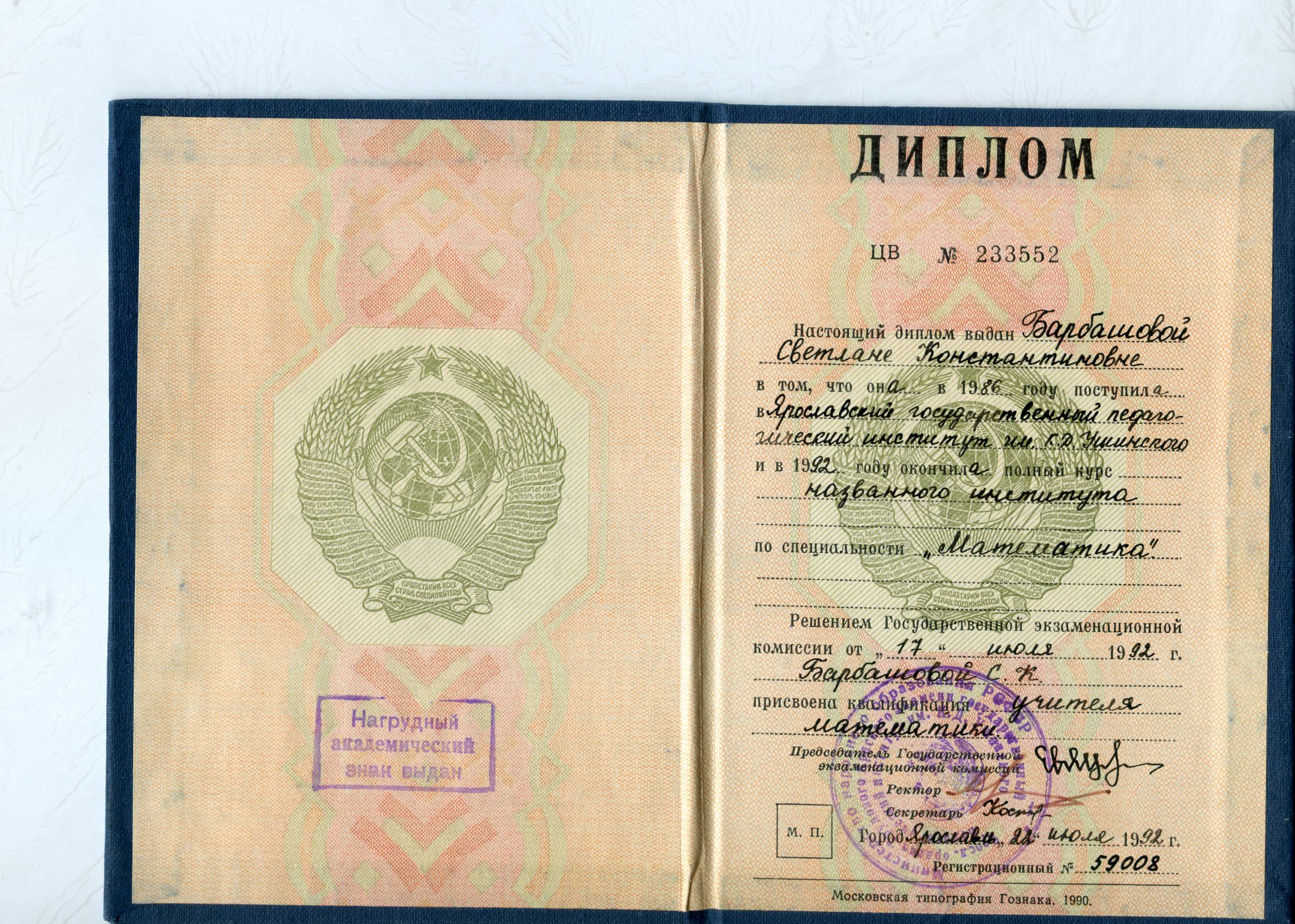 Образование по специальности: учитель математики. Присвоена квалификация: учитель математики. Документ о получении образования: скачать