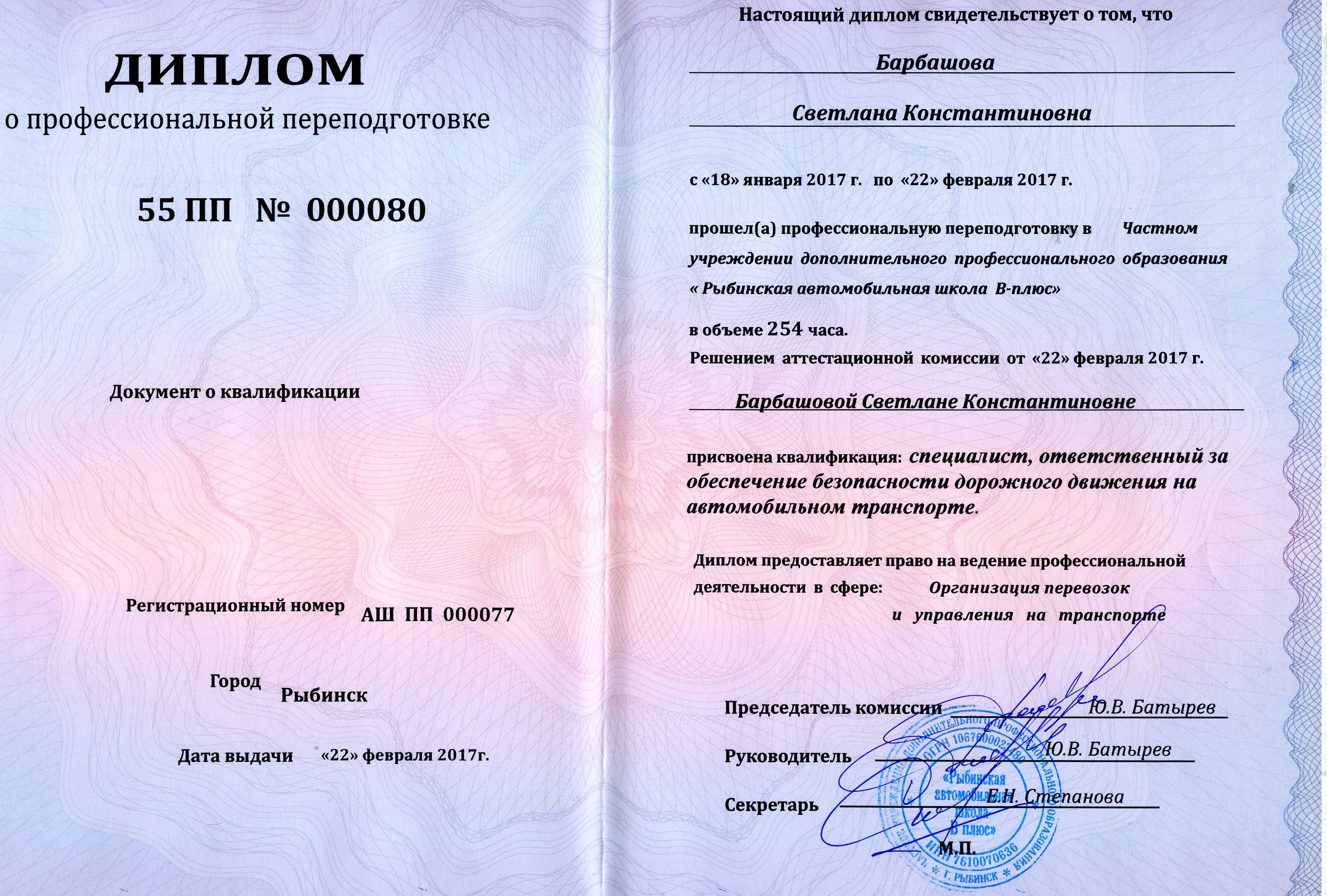 Образование по специальности: специалист, ответственный за обеспечение безопасности дорожного движения на автомобильном транспорте. Присвоена квалификация: организация перевозок и управления на транспорте. Документ о получении образования: скачать