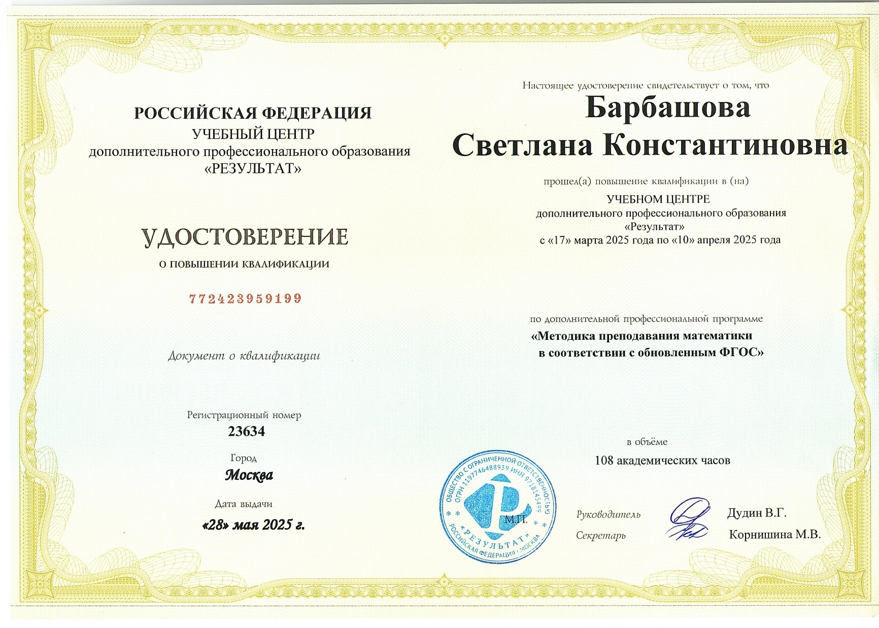Обучение по курсу: «Методика преподавания математики в соответствии с обновленным ФГОС». Документ о повышении квалификации: скачать