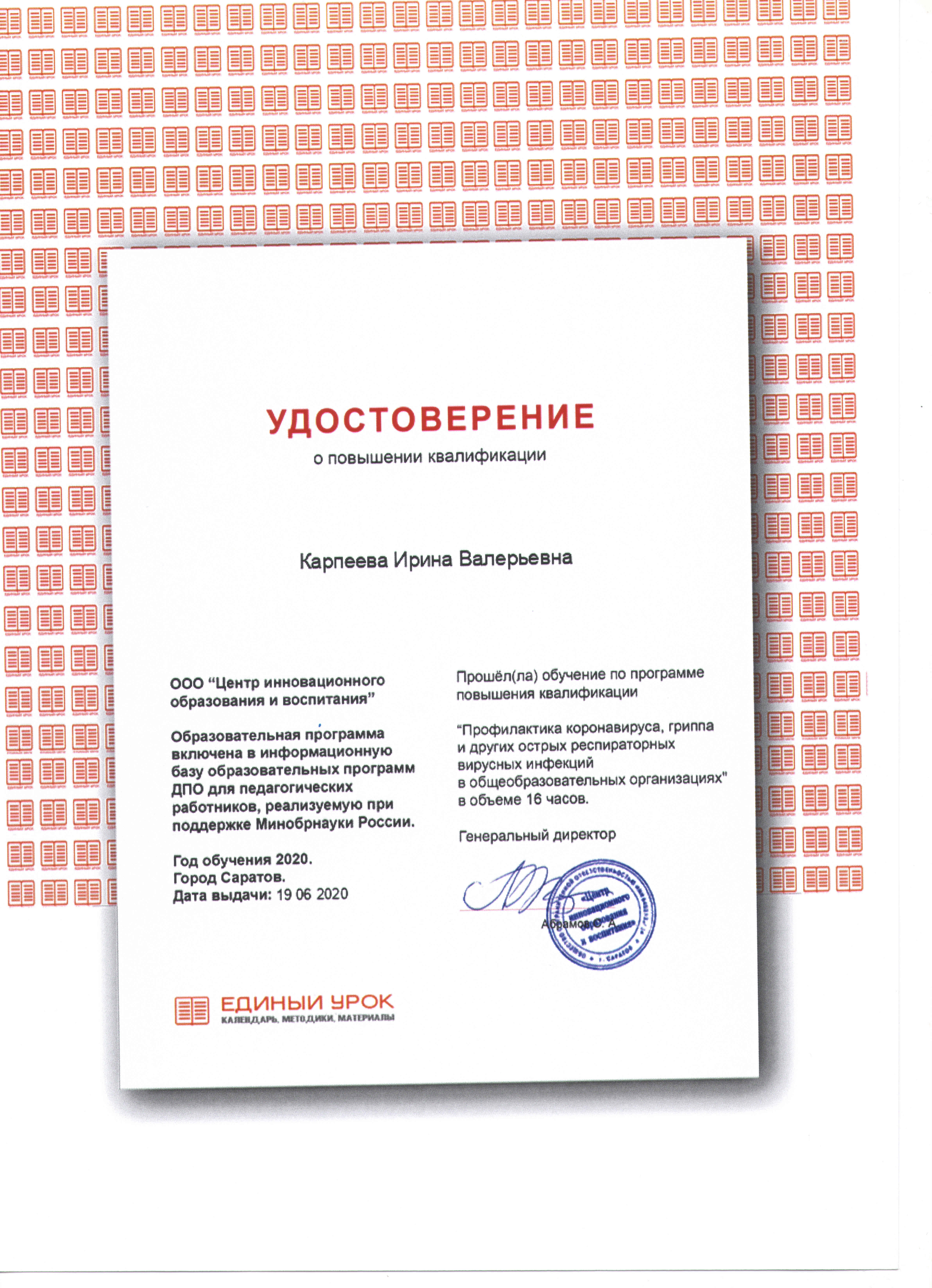 Обучение по курсу: "Профилактика короновируса, гриппа и других острых респираторных инфекций в общеобразовательных организациях". Документ о повышении квалификации: скачать