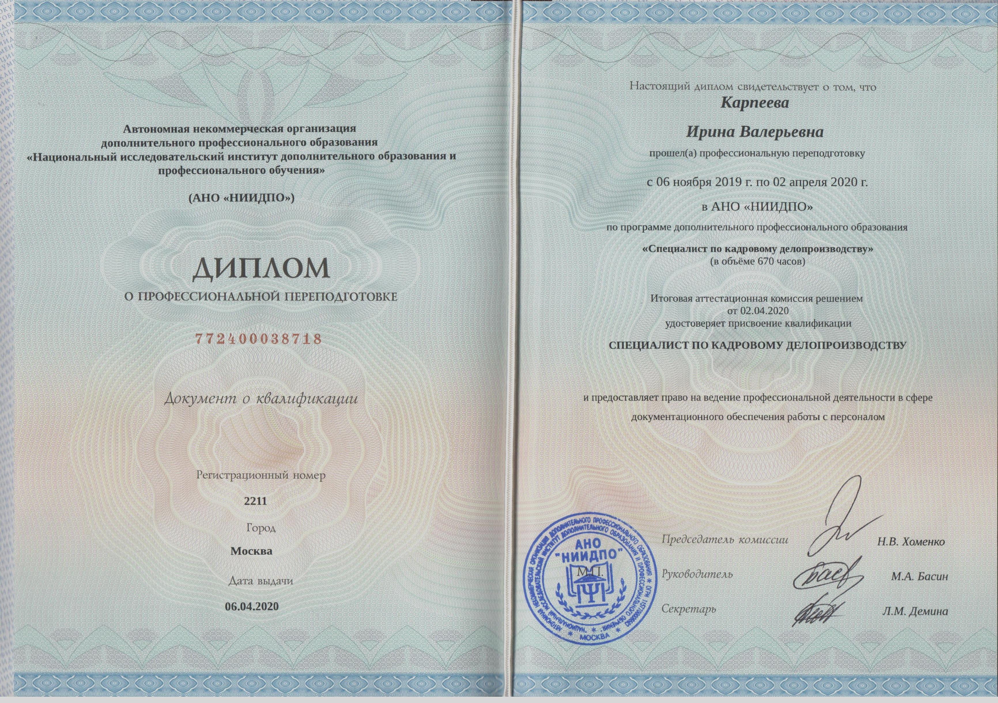 Образование по специальности: Управление персоналом. Присвоена квалификация: Специалист по кадровому делопроизводству. Документ о получении образования: скачать