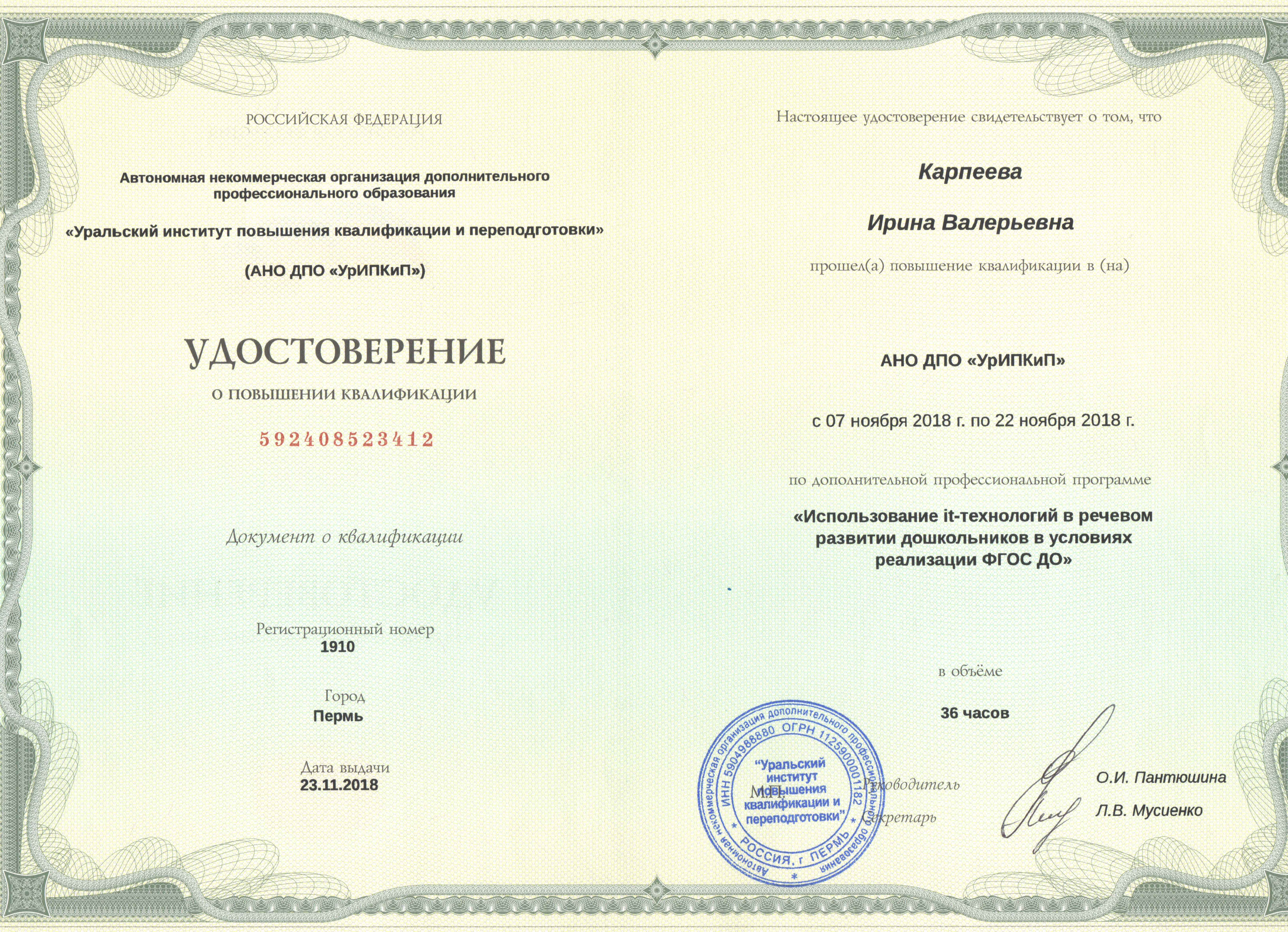 Обучение по курсу: "Использование it-технологий в речевом развитии дошкольников в условиях реализации ФГОС ДО". Документ о повышении квалификации: скачать
