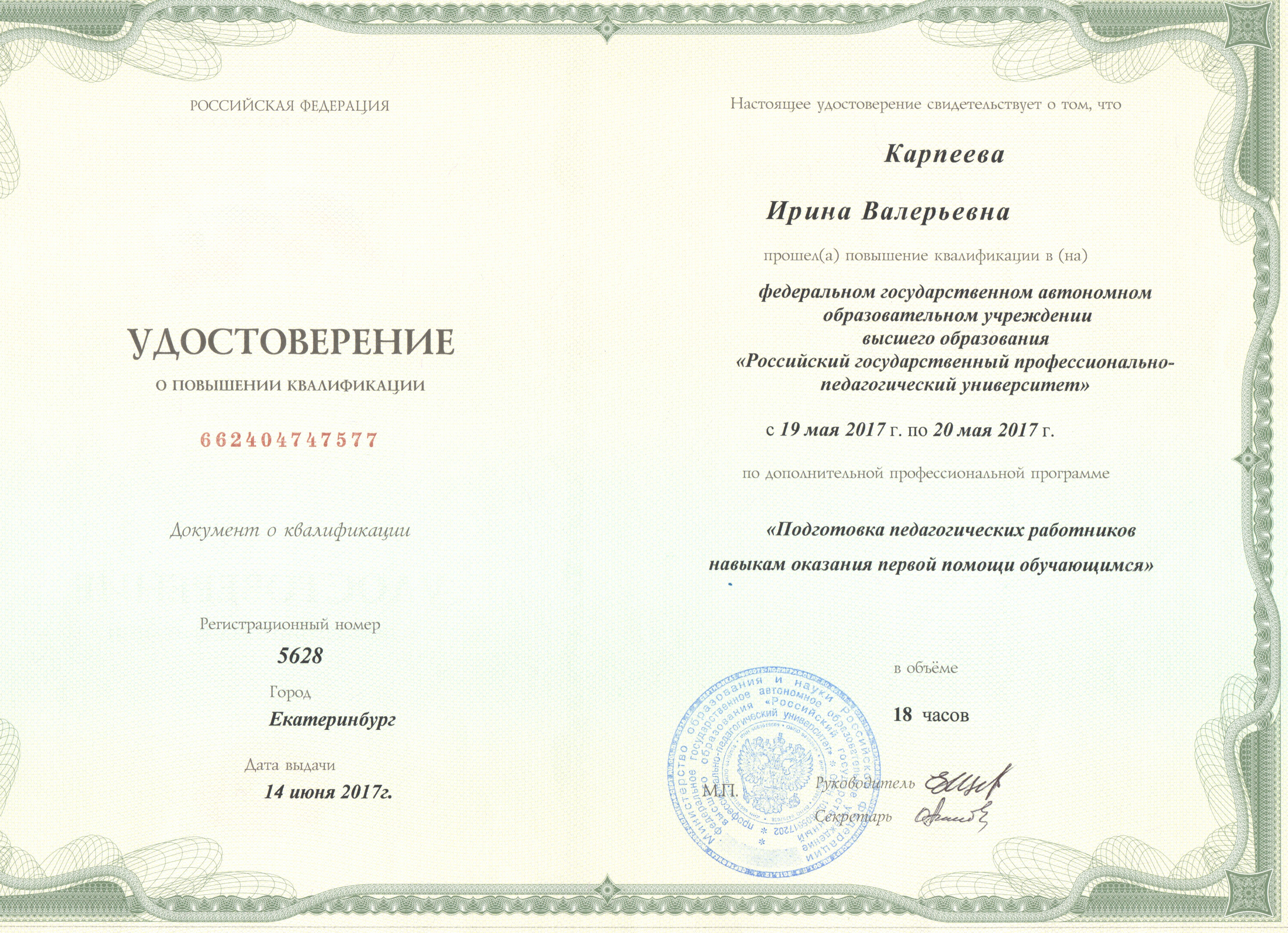 Обучение по курсу: "Подготовка педагогических работников навыкам оказания первой помощи обучающимся". Документ о повышении квалификации: скачать