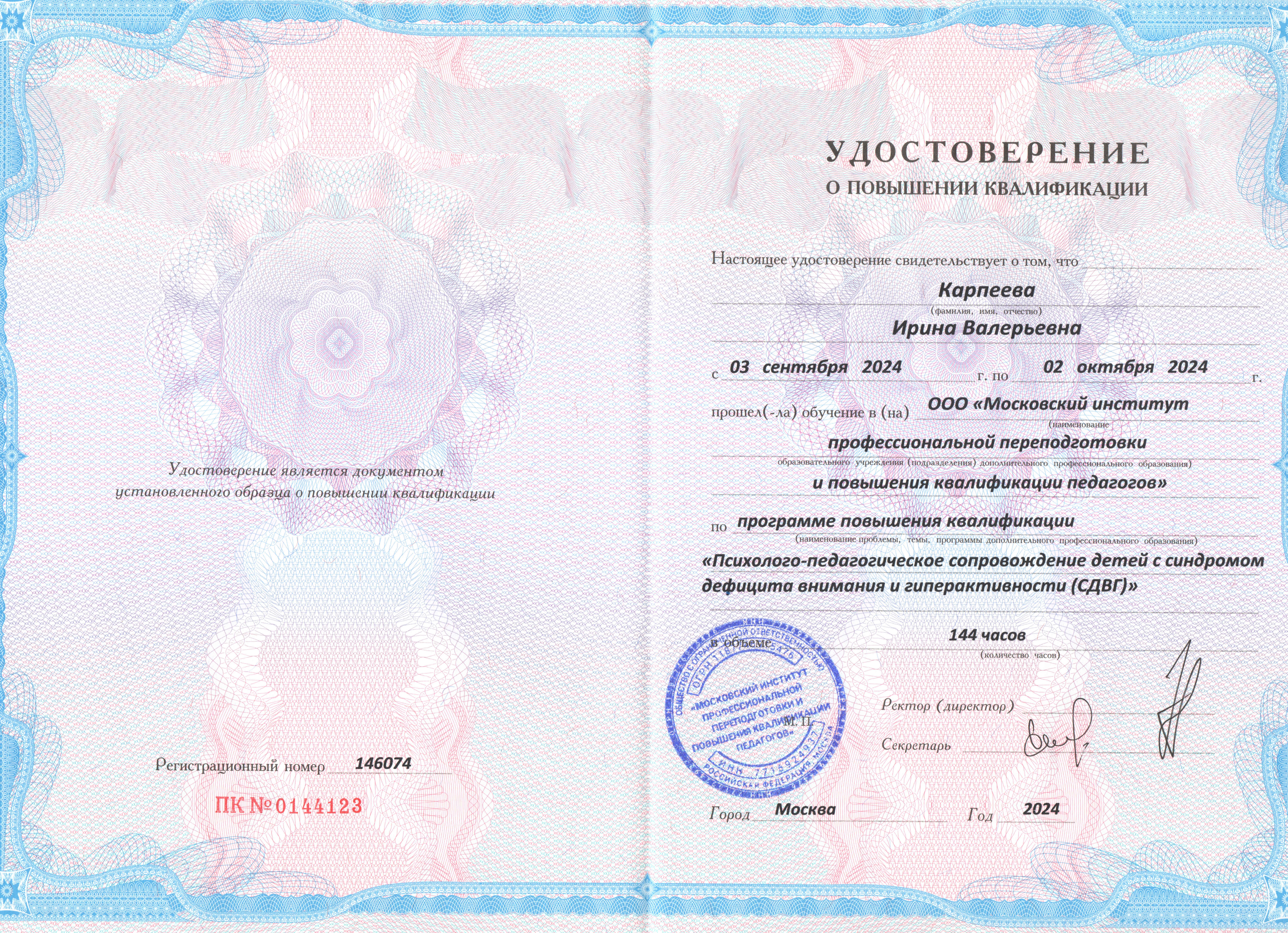 Обучение по курсу: "Психолого-педагогическое сопровождение детей с синдромом дефицита внимания и гиперактивности (СДВГ)". Документ о повышении квалификации: скачать