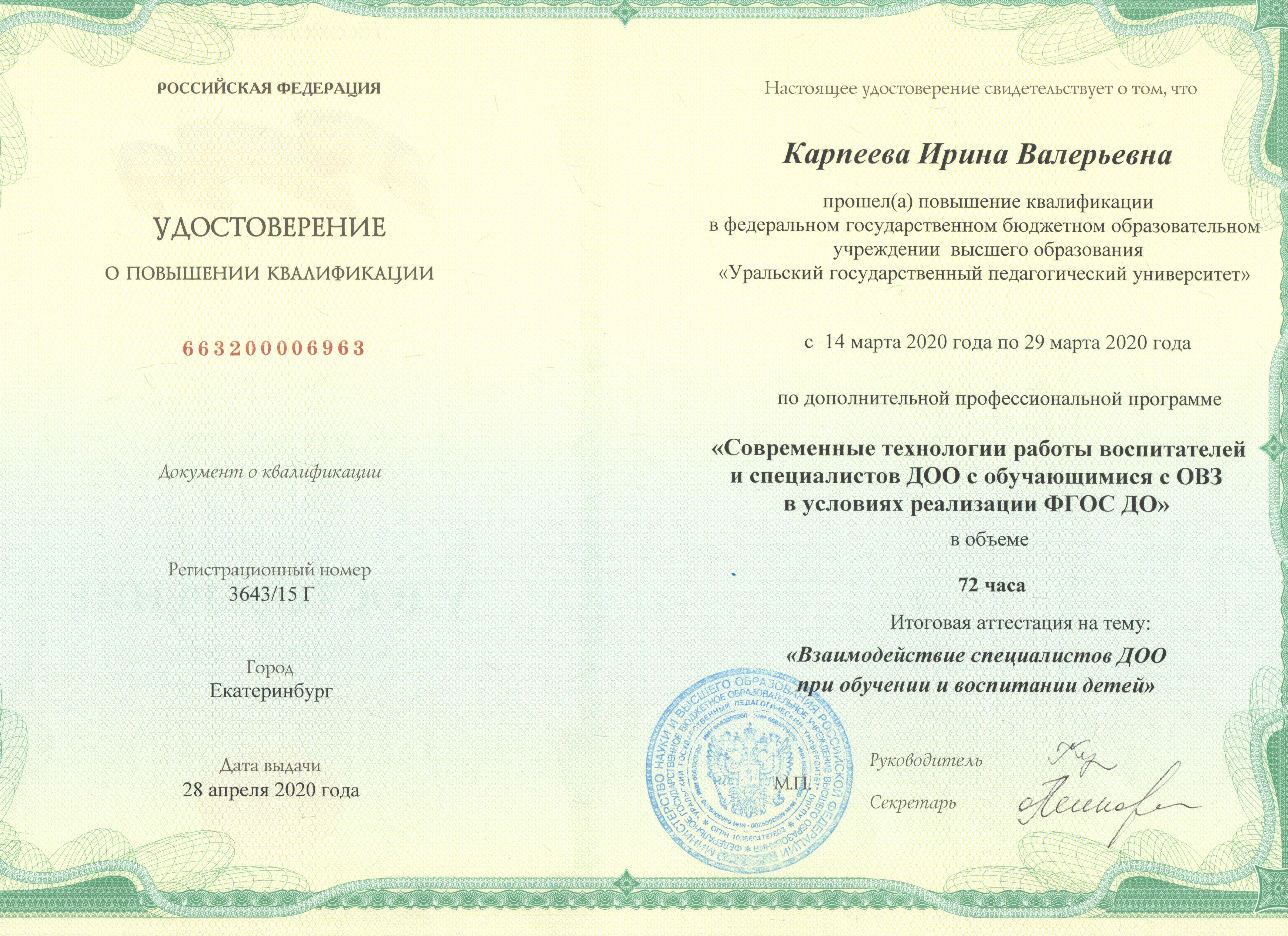 Обучение по курсу: "Взаимодействие специалистов ДОО при обучении и воспитании детей". Документ о повышении квалификации: скачать