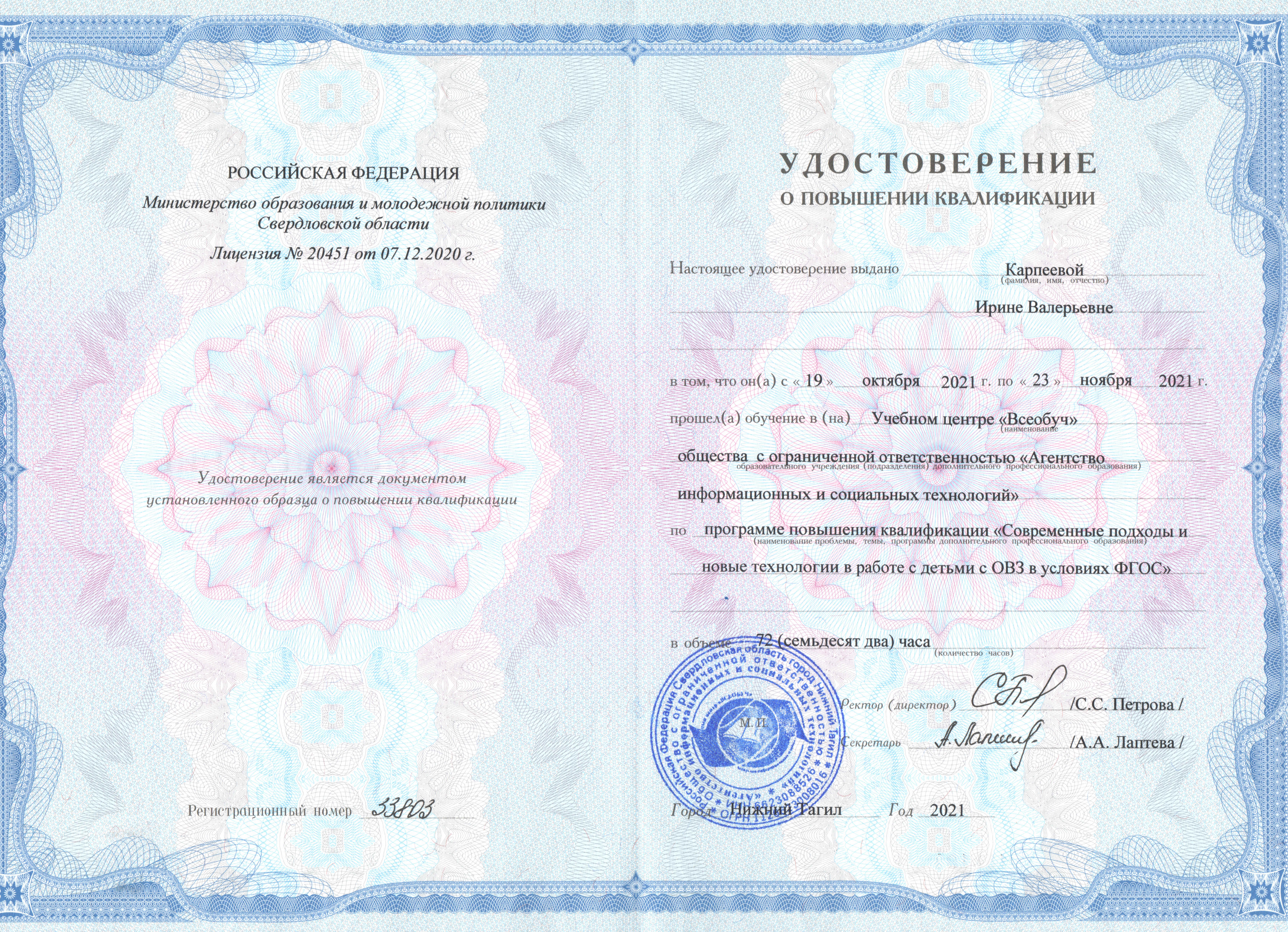 Обучение по курсу: "Современные подходы и новые технологии в работе с детьми с ОВЗ в условиях ФГОС". Документ о повышении квалификации: скачать