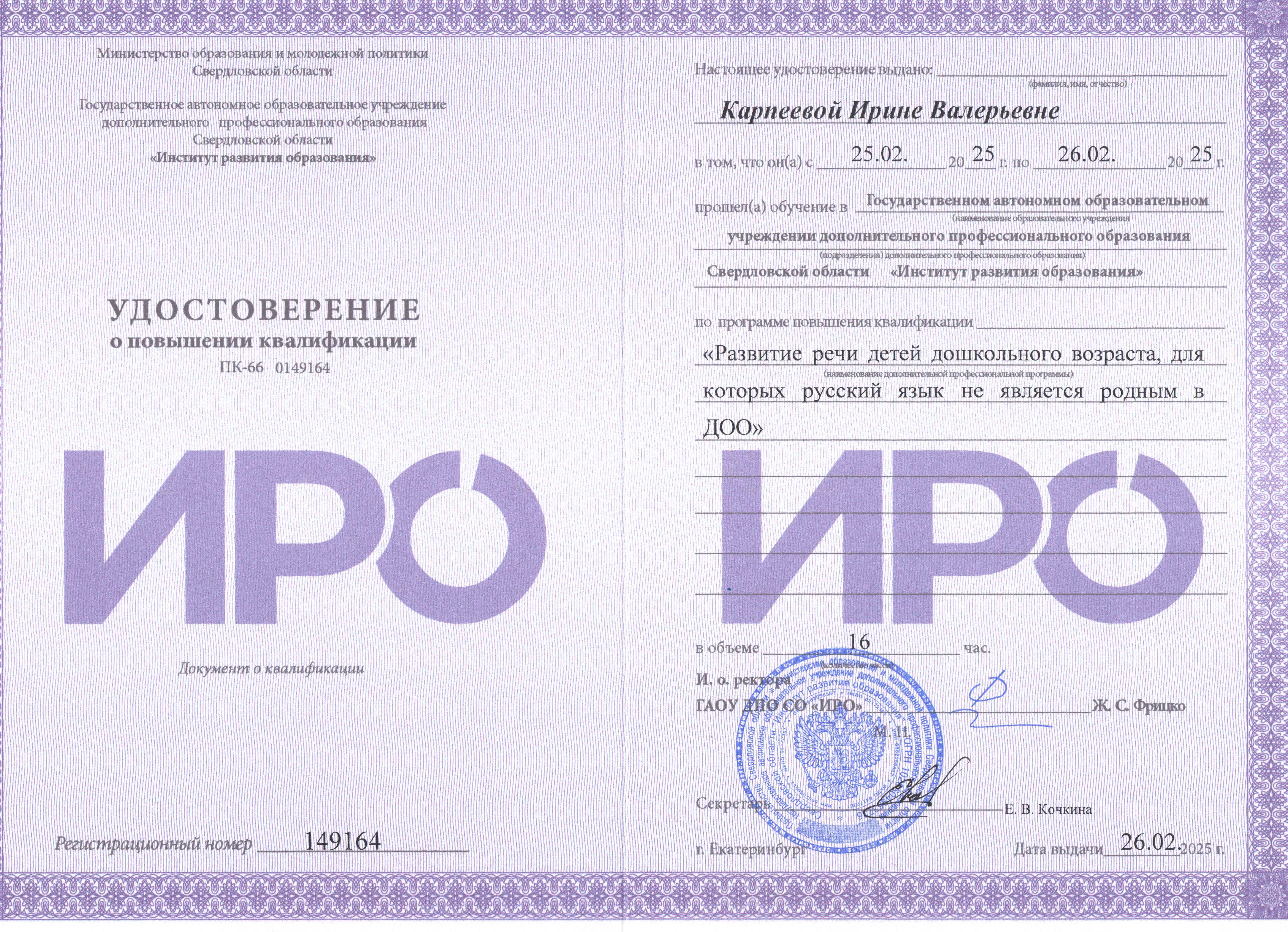 Обучение по курсу: "Развитие речи детей дошкольного возраста, для которых русский язык не является родным в ДОО". Документ о повышении квалификации: скачать