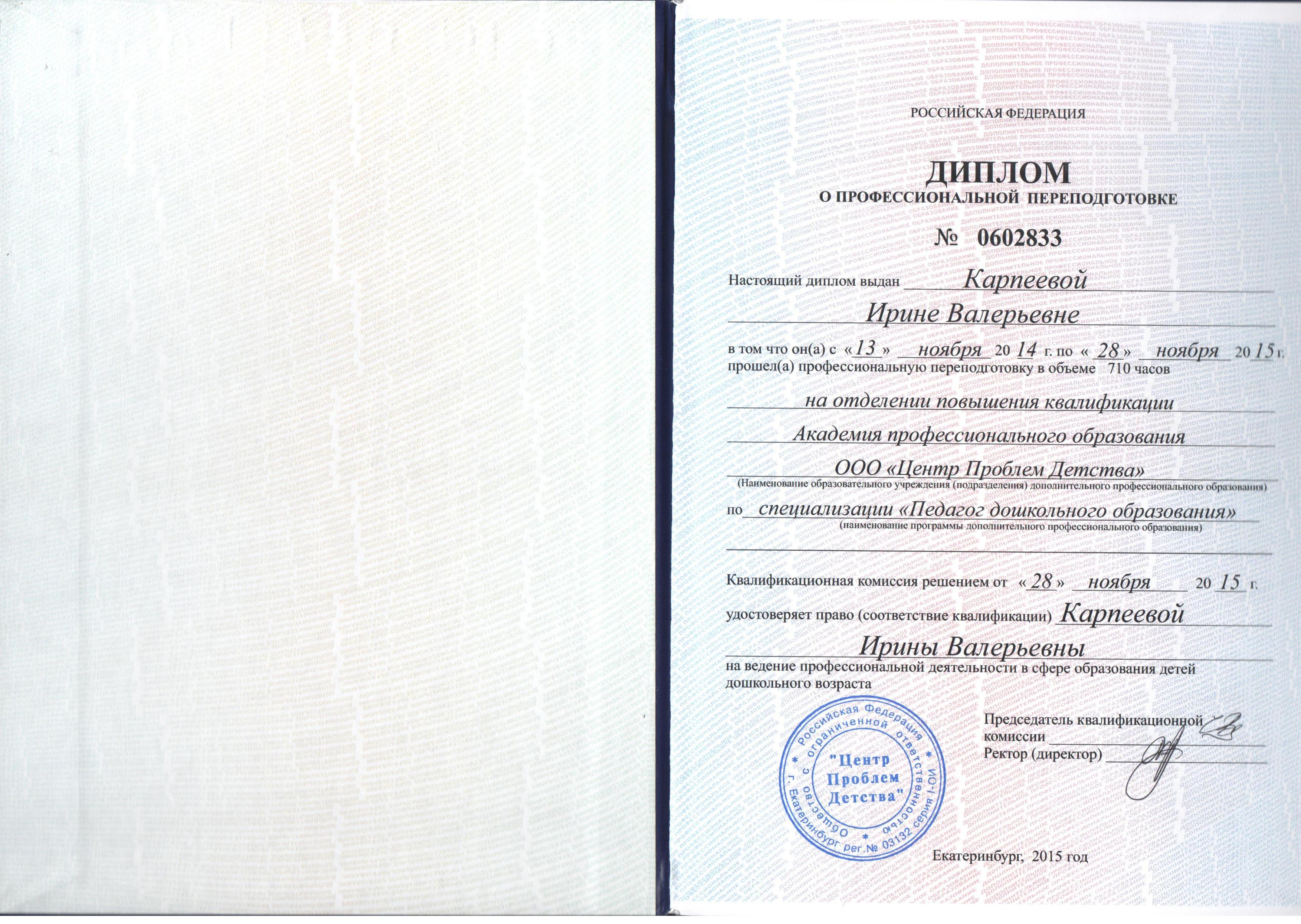 Образование по специальности: Дошкольное образование. Присвоена квалификация: Педагог дошкольного образования. Документ о получении образования: скачать