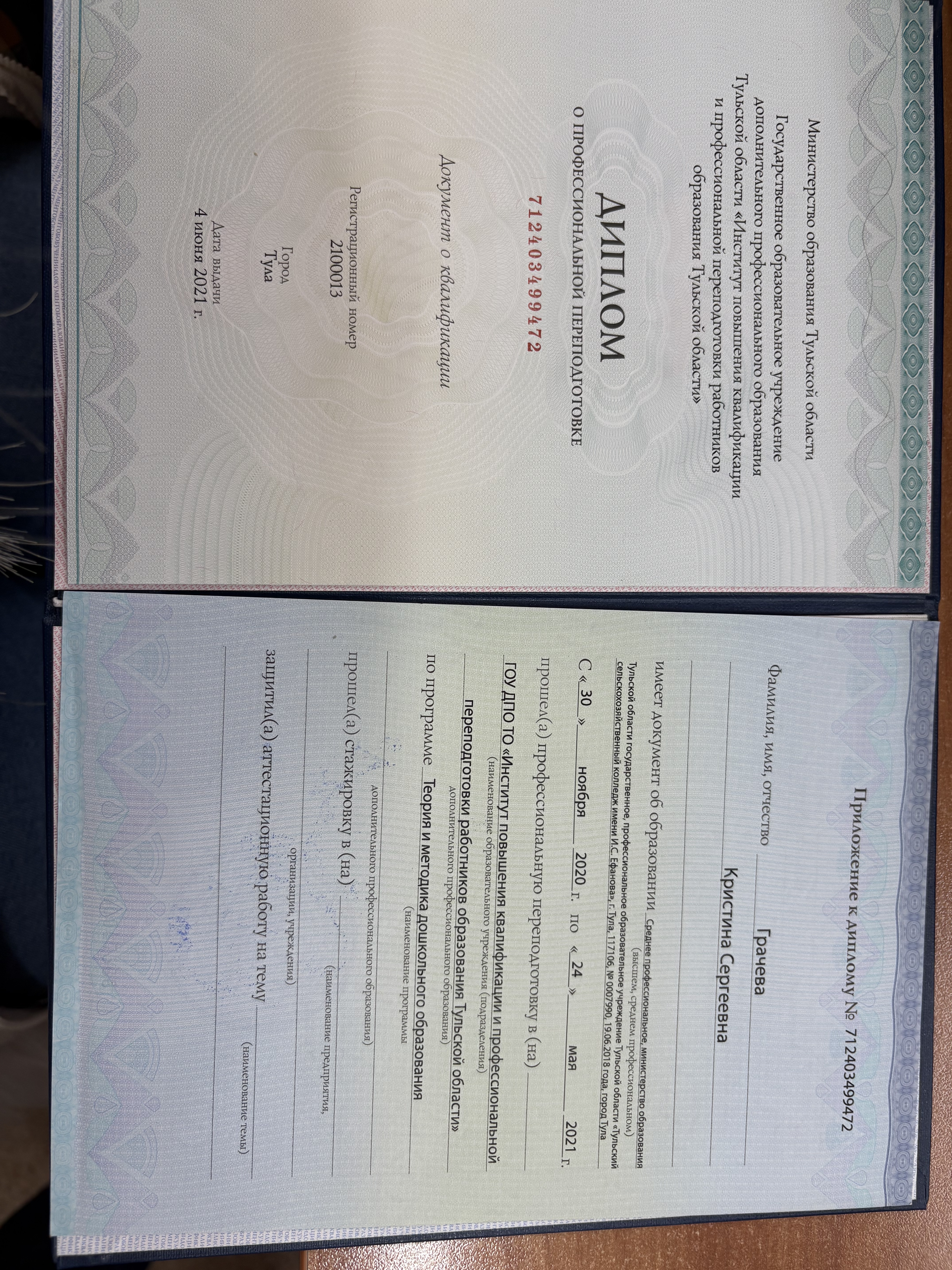 Образование по специальности: Воспитатель . Присвоена квалификация: Воспитатель. Документ о получении образования: скачать