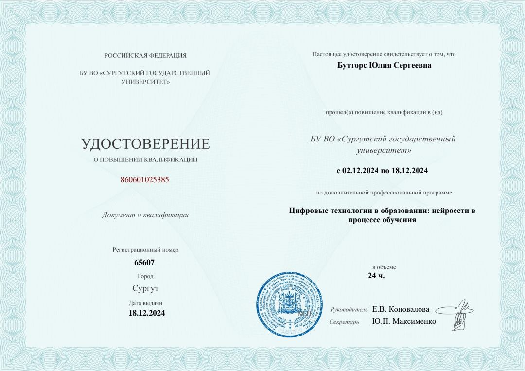 Обучение по курсу: Цифровые технологии в образовании: нейросети в процессе обучения. Документ о повышении квалификации: скачать