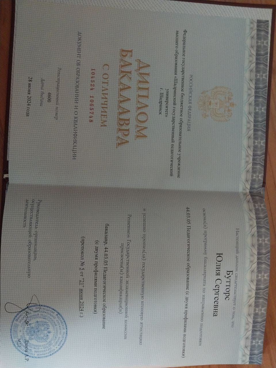 Образование по специальности: 44.03.05 Педагогическое образование с двумя профилями подготовки "Русский язык" и "Литература",. Присвоена квалификация: учитель русского языка и литературы . Документ о получении образования: скачать