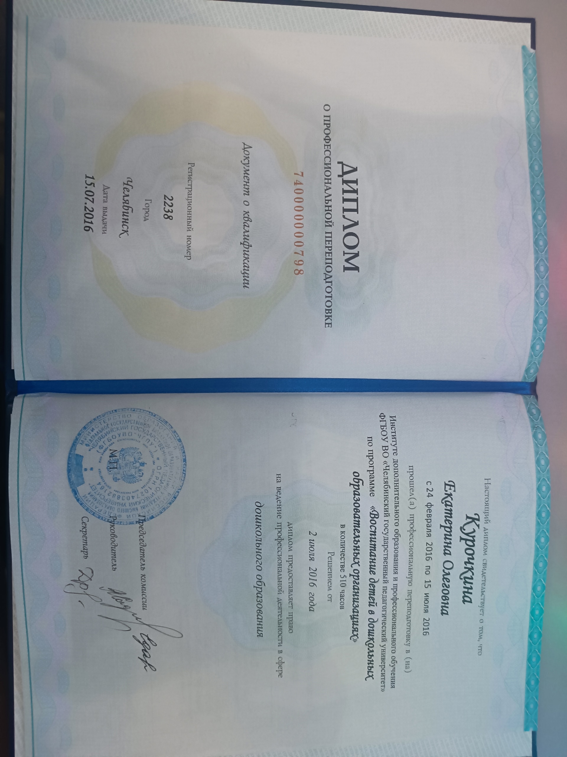 Образование по специальности: Воспитание детей в дошкольных образовательных организациях. Присвоена квалификация: дошкольное образование. Документ о получении образования: скачать
