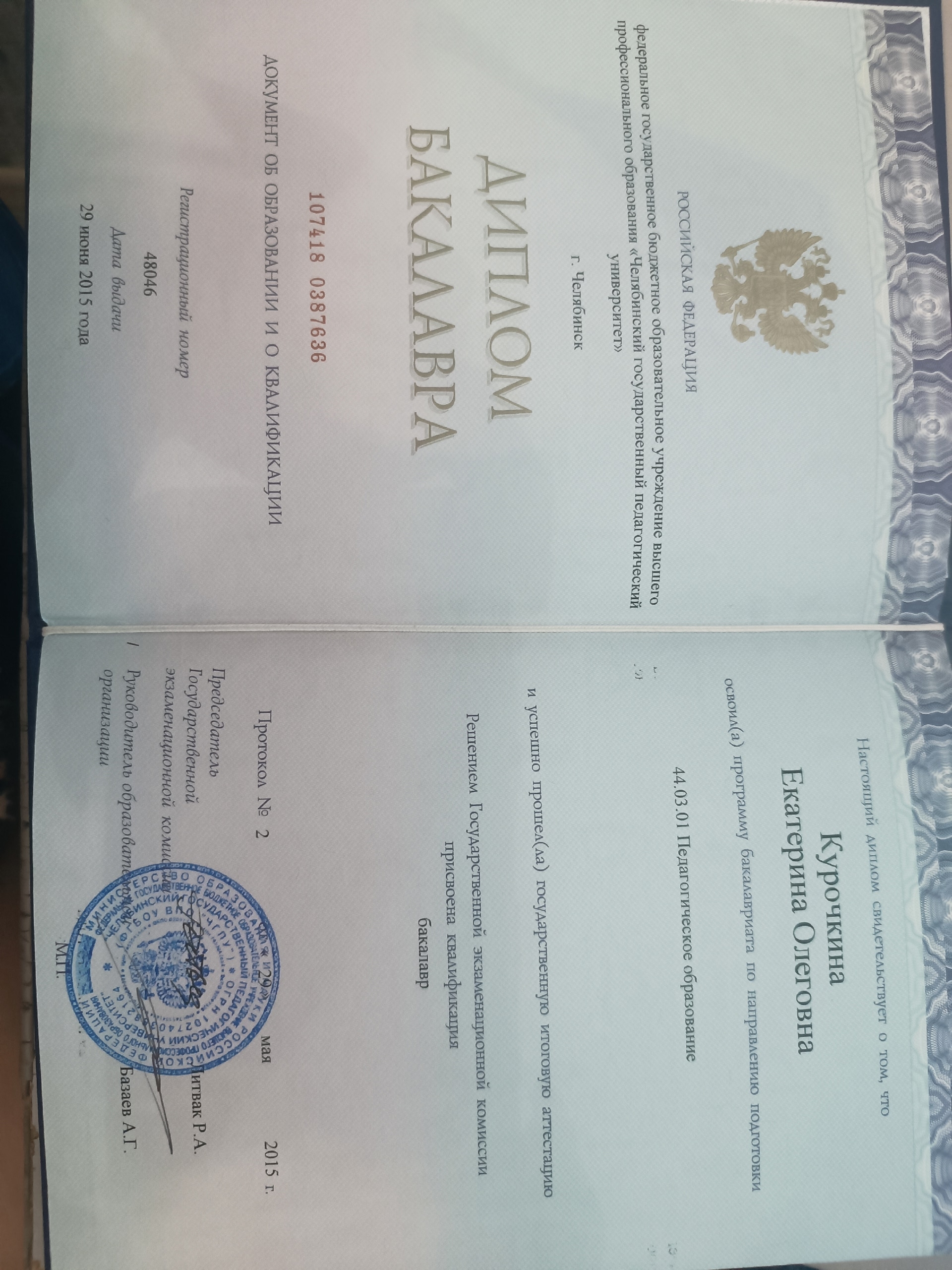 Образование по специальности: Педагогика. Присвоена квалификация: Педагогическое образование. Документ о получении образования: скачать