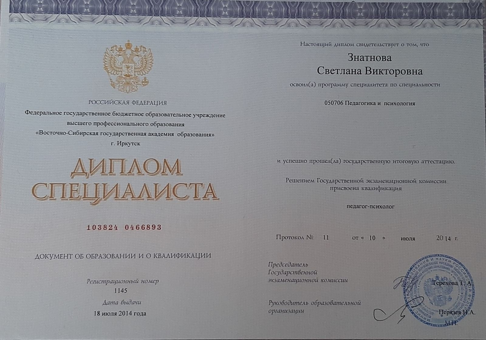 Присвоена квалификация: Педагог - психолог.
