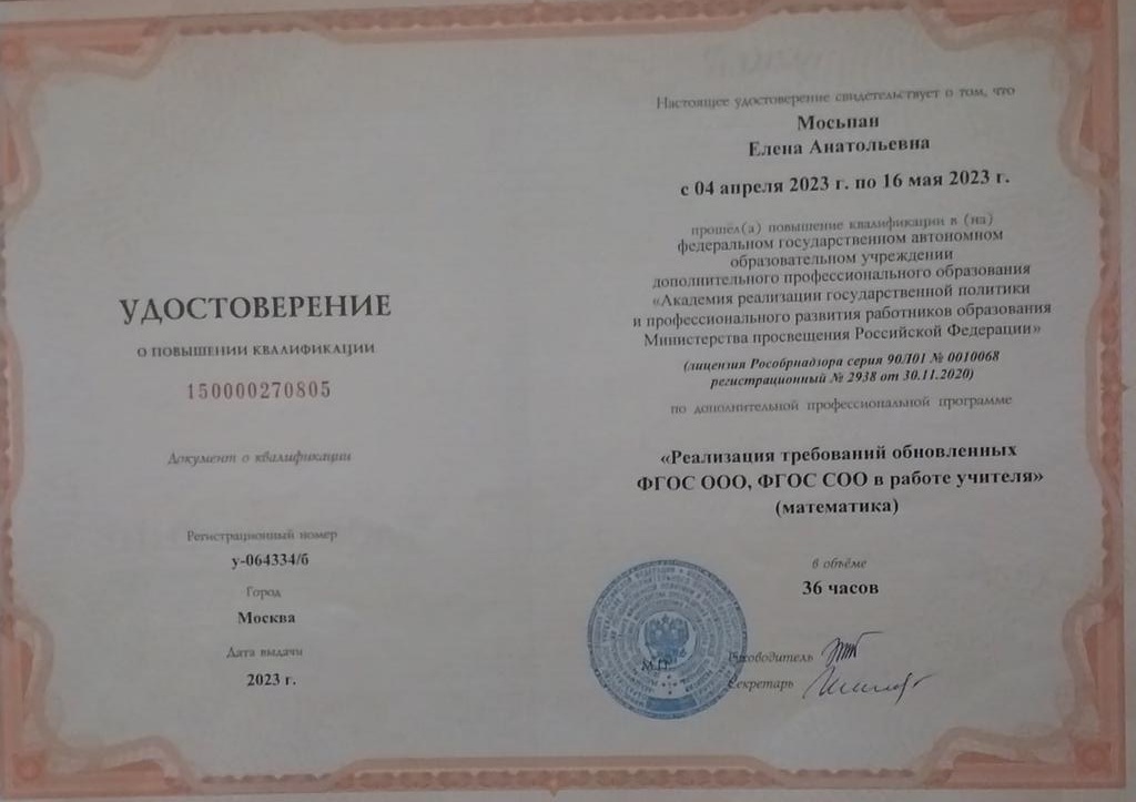 Обучение по курсу: Реализация требований, обновленных ФГОС ООО, ФГОС СОО в работе учителя (математика). Документ о повышении квалификации: скачать
