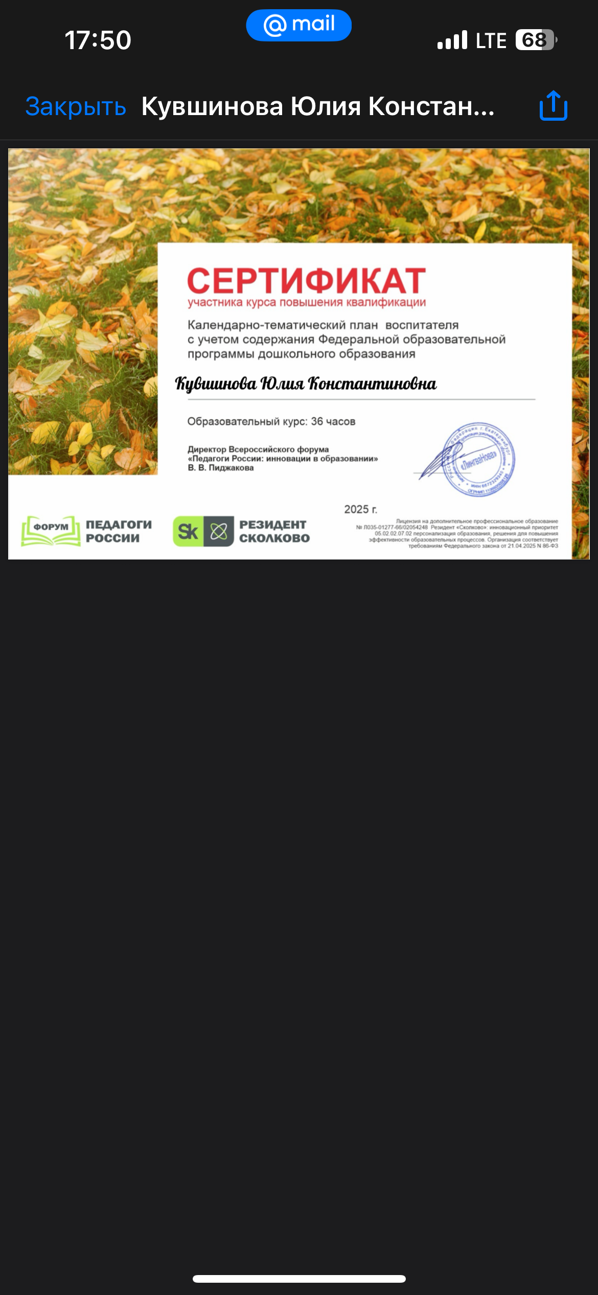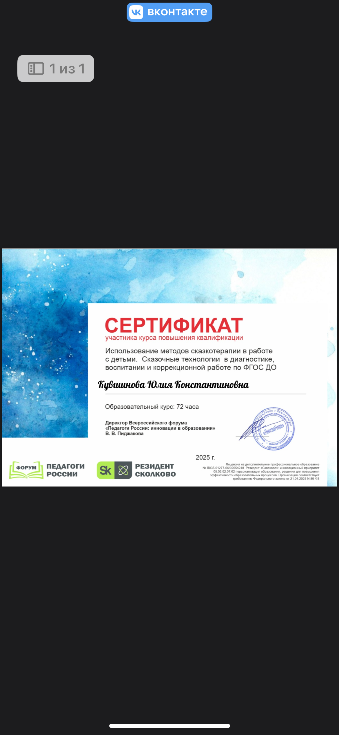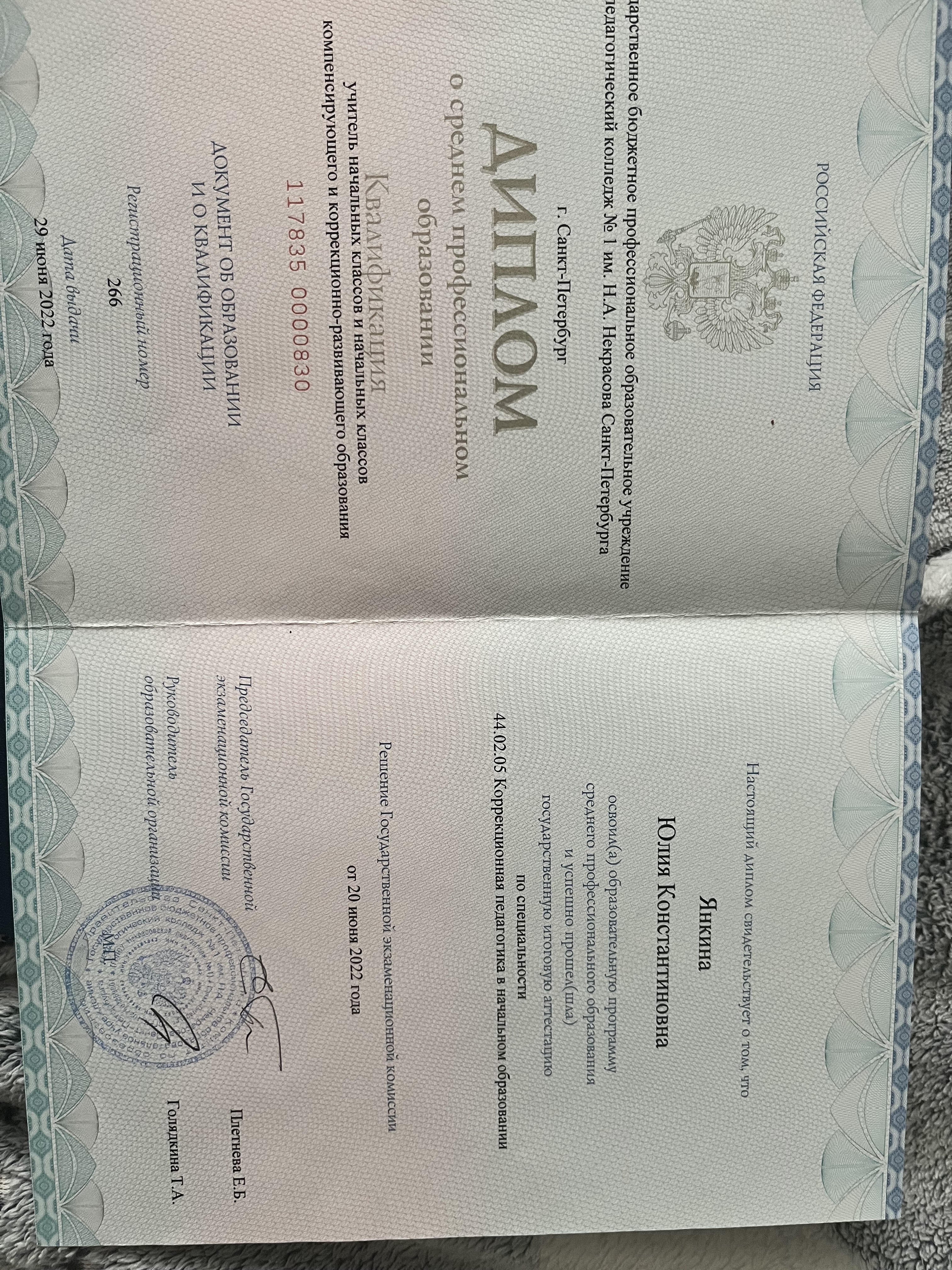 Образование по специальности: Учитель начальных классов и начальных классов компенсирующего и коррекционно-развивающего образования . Присвоена квалификация: Учитель . Документ о получении образования: скачать